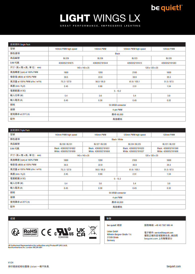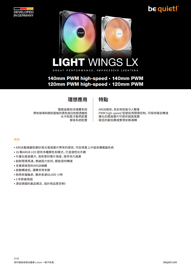 be quiet! Light Wings LX 120mm PWM high-speed Triple Pack WHITE 機箱風扇 (TH-BLWHS3W)