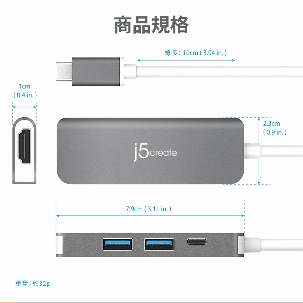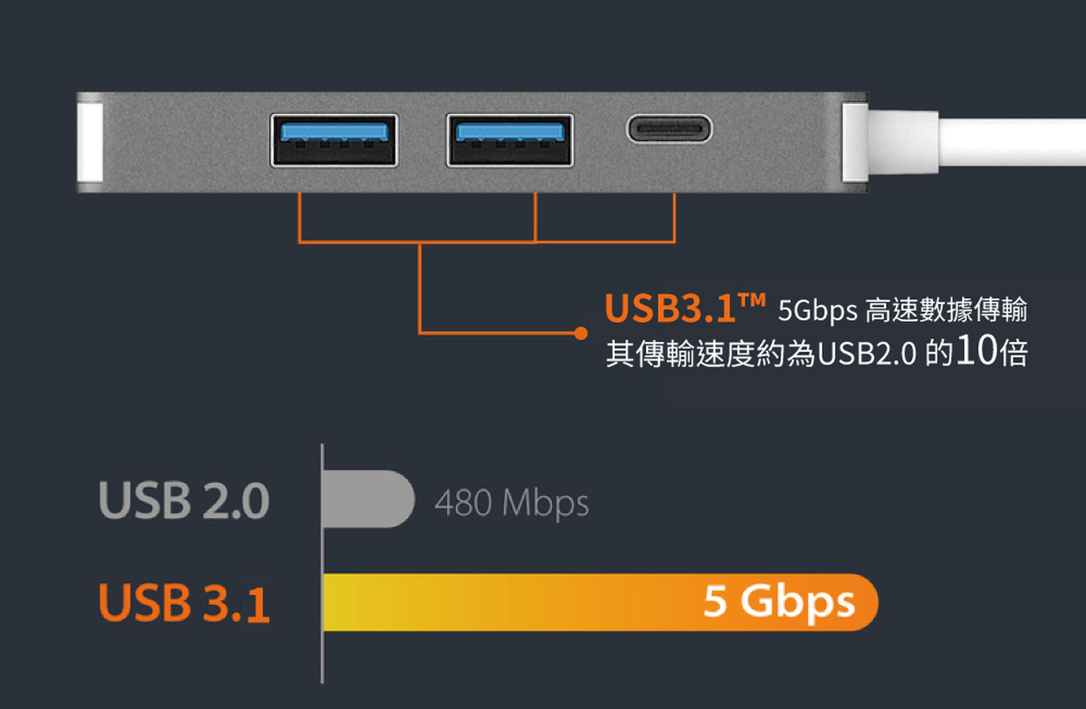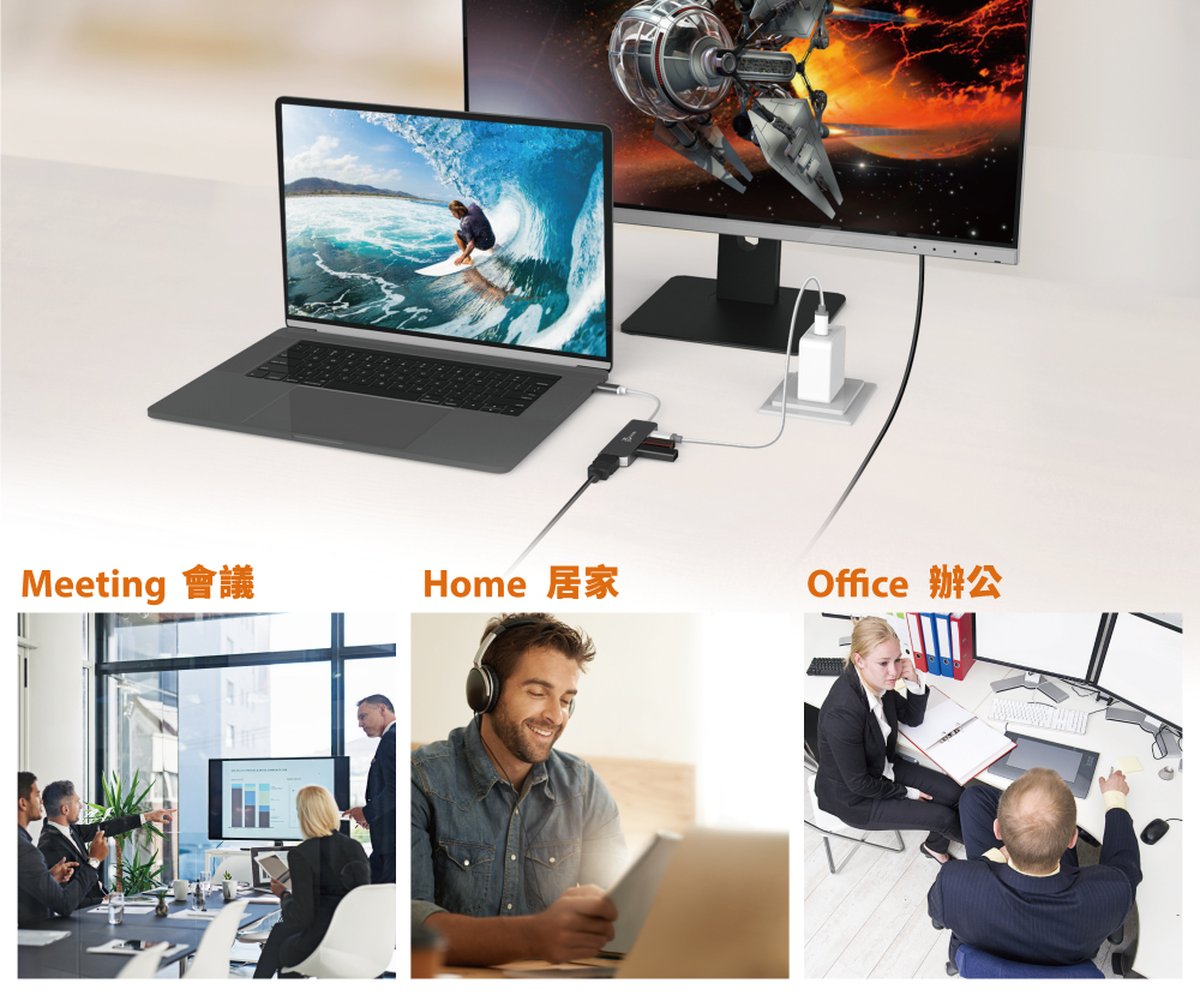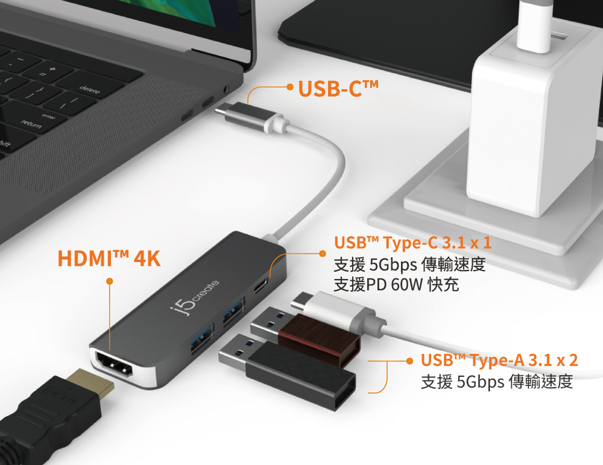 HDMI Female x 1(支援最高解析度4K @ 30Hz) USB Type-A Gen1 x 2(傳輸速率5Gbps) USB Type-C x 1(支援 PD,最大輸出60W/資料傳輸5Gbps) 電源模式