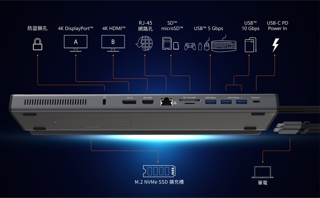 ▸ 12 合 1 功能,擴充 9 款接口及 SSD 儲存 (SSD 需另購)