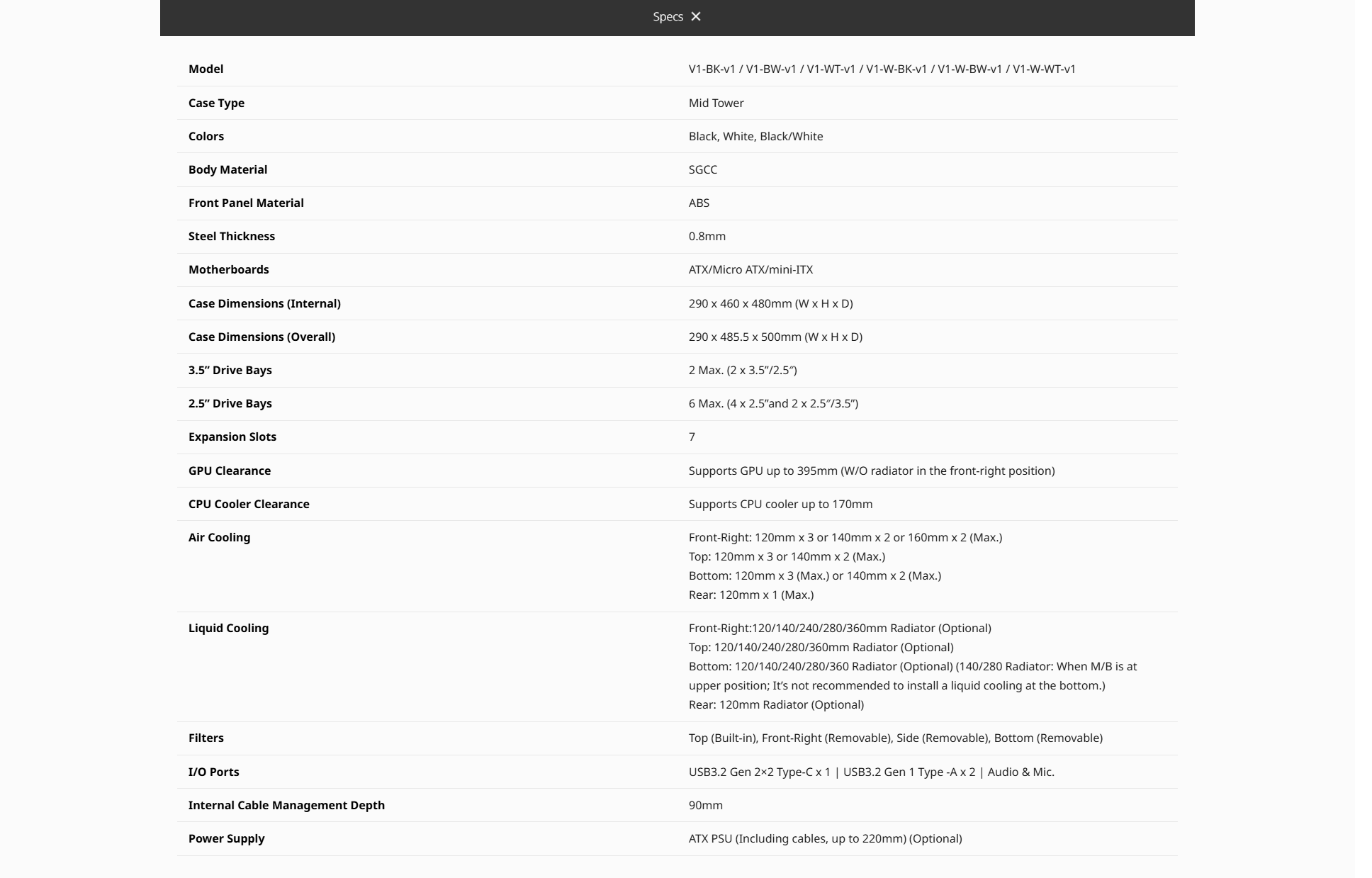 | Motherboard Support | ATX / micro ATX / mini-ITX |