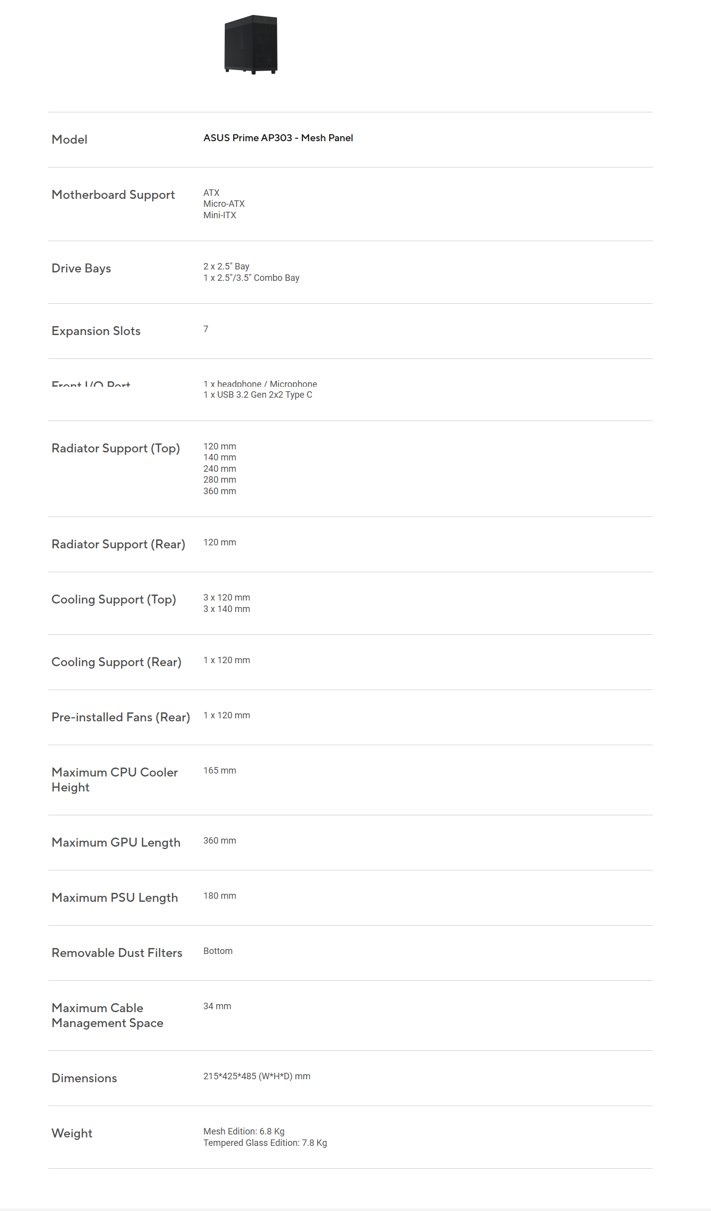 | Motherboard Support | mini-ITX, micro-ATX, ATX |