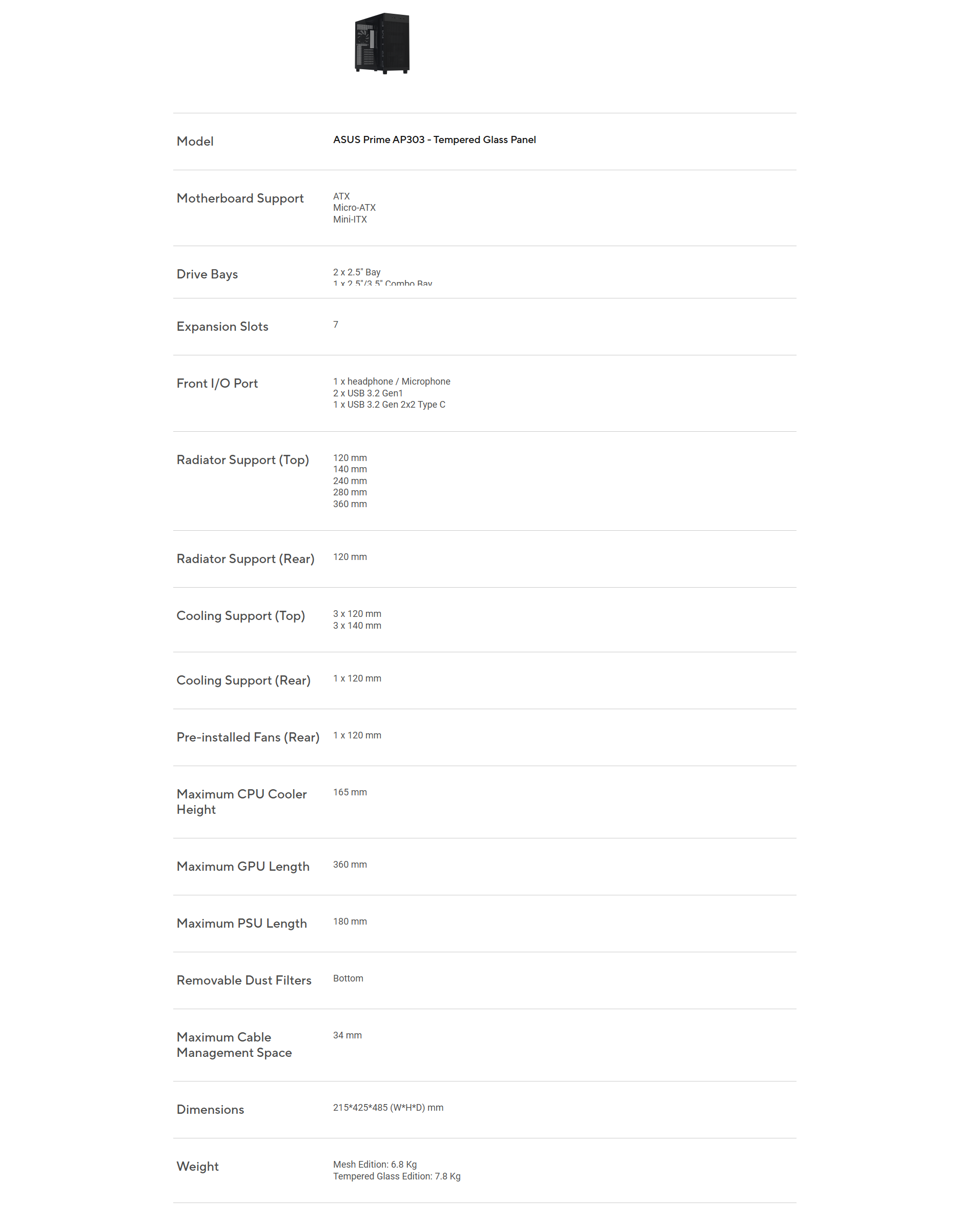 | Pre-installed Fan | Rear : 1 x 120 mm |