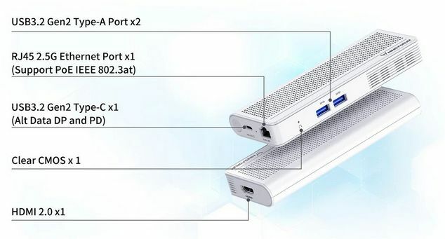 HDMI (2.0) x 1 USB 3.2 Gen2 Type-C x 1 (Alt Data DP and PD) USB 3.2 Gen2 Type-A Port x 2 RJ45 2.5G Ethernet Port x 1 (Support PoE IEEE 802.3at) Clear CMOS x 1  |