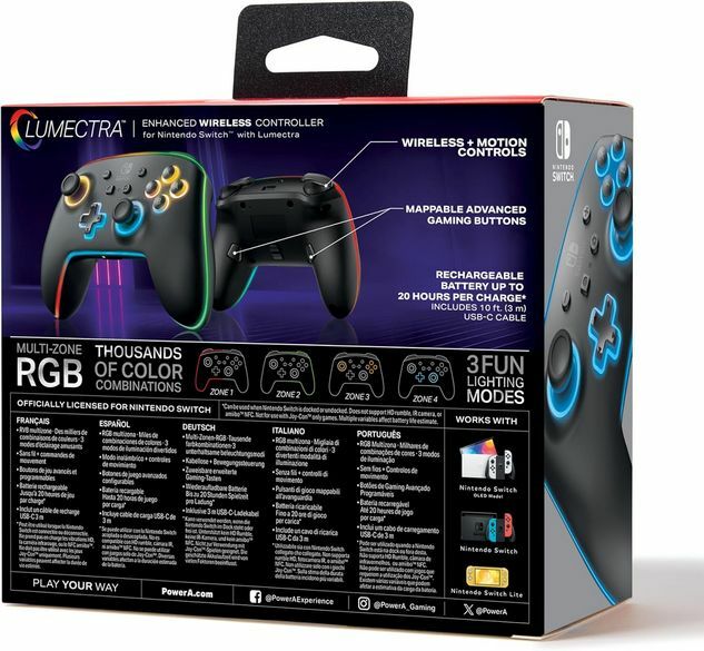 Illuminate the possibilities with the PowerA Enhanced Wireless Controller for Nintendo Switch with Lumectra. 24 colors, 4 individual lighting zones and 3 lighting modes for thousands of combinations.