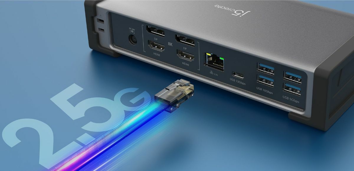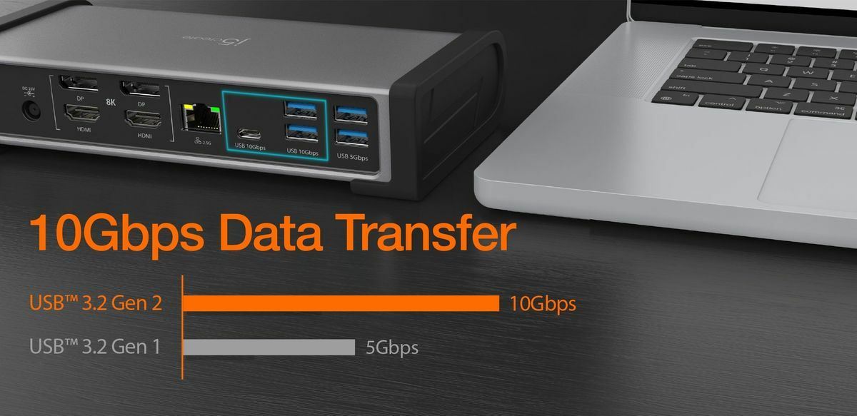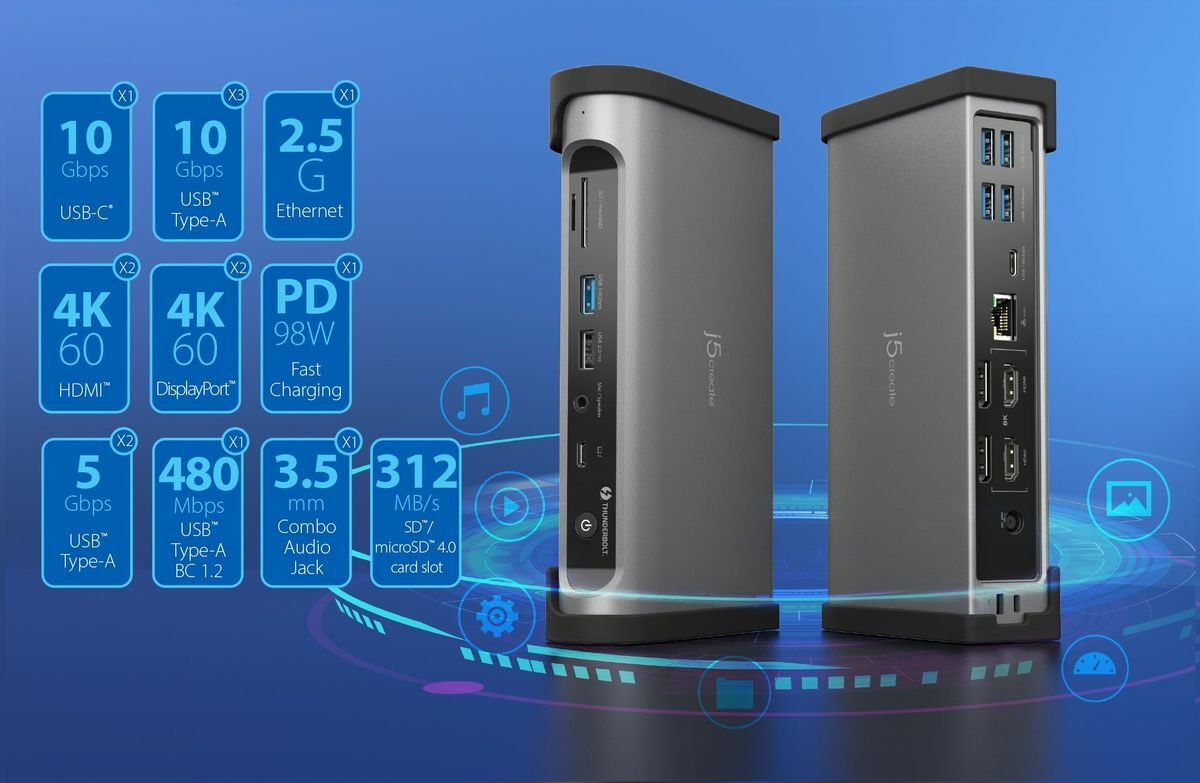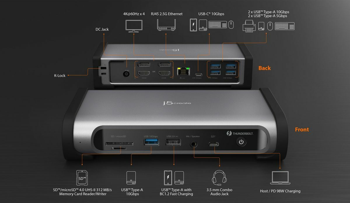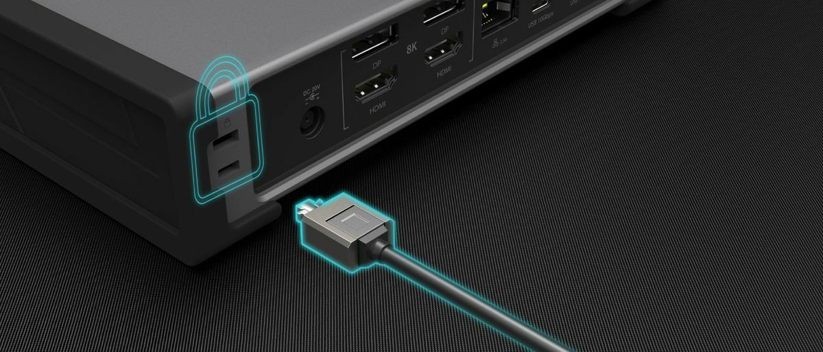 | Ports | 1 x USB-C® Power Delivery 98W (Host) 2 x HDMI™ 2.1 2 x DisplayPort™ 1.4 1 x USB-C® 10Gbps 3 x USB™ 3.2 Type-A Gen 2 10Gbps 2 x USB™ 3.2 Type-A Gen 1 5Gbps 1 x USB™ 2.0 Type-A with BC1.2 1 x SD™/microSD™ 4.0 UHS-II 312 MB/s memory card reader/writer 1 x 3.5 mm combo audio jack 1 x RJ45 2.5 Gigabit Ethernet  |