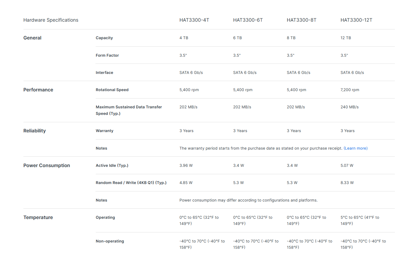 | Rotational Speed | 4TB / 6TB / 8TB : 5400 rpm 12TB : 7200 rpm |