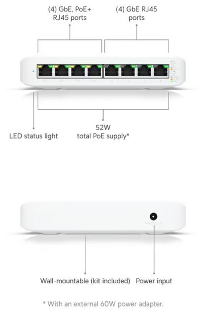 Ubiquiti UniFi  Lite 8 PoE is a fully managed Layer 2 switch with eight Gigabit Ethernet ports for your RJ-45 Ethernet devices. Four ports also offer auto-sensing 802.3at PoE+ that provide up to a total PoE wattage of 52W for UniFi Access Points or other PoE devices.