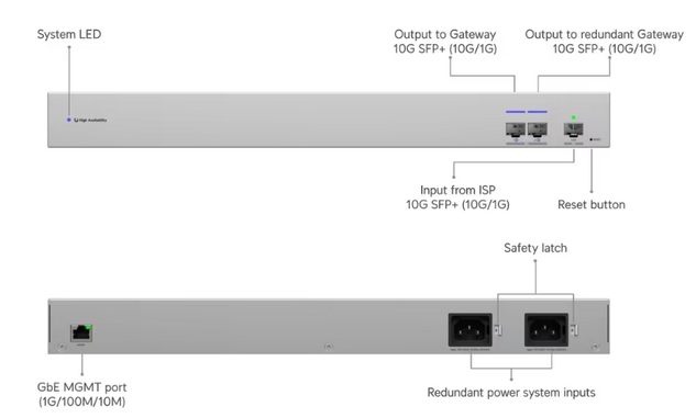 A 10G SFP+ WAN switch connects two shadow-mode high-availability UniFi gateways to a single ISP. Note: For deployments with multiple ISPs, use an additional USW-WAN switch.