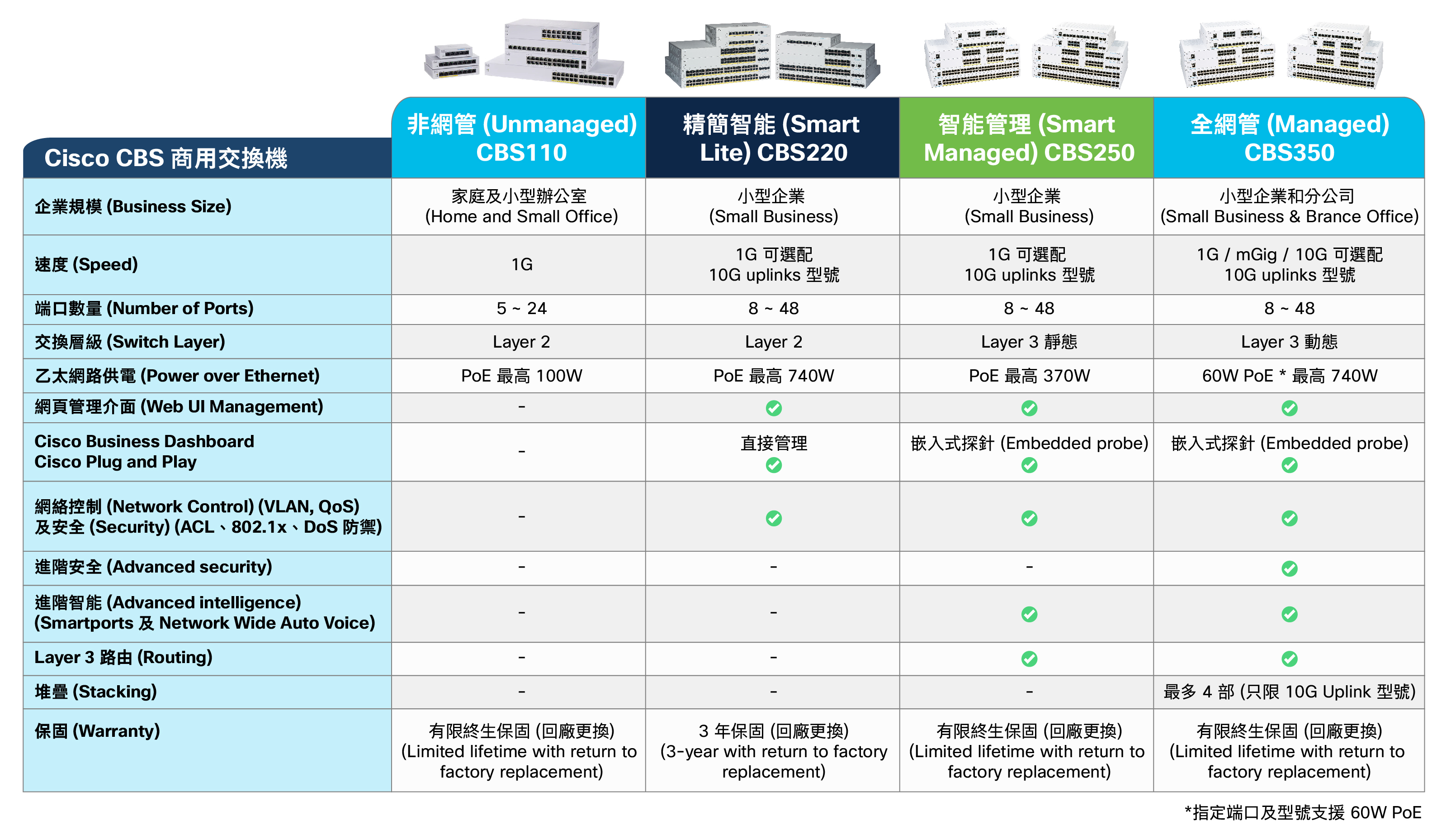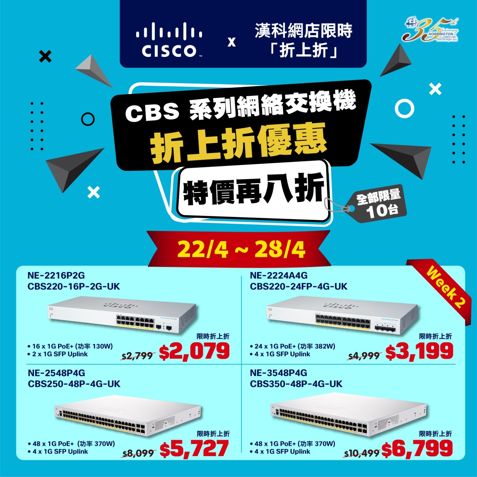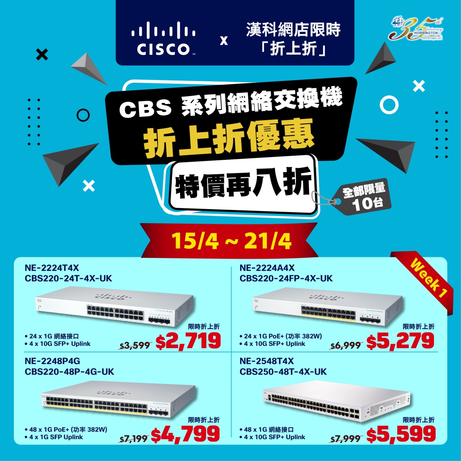 連續兩星期,每星期精選 4 款指定型號 Cisco CBS 系列網絡交換機,除網店優惠價外再「八折」優惠 1)!每款限量 10 台,售完即止。