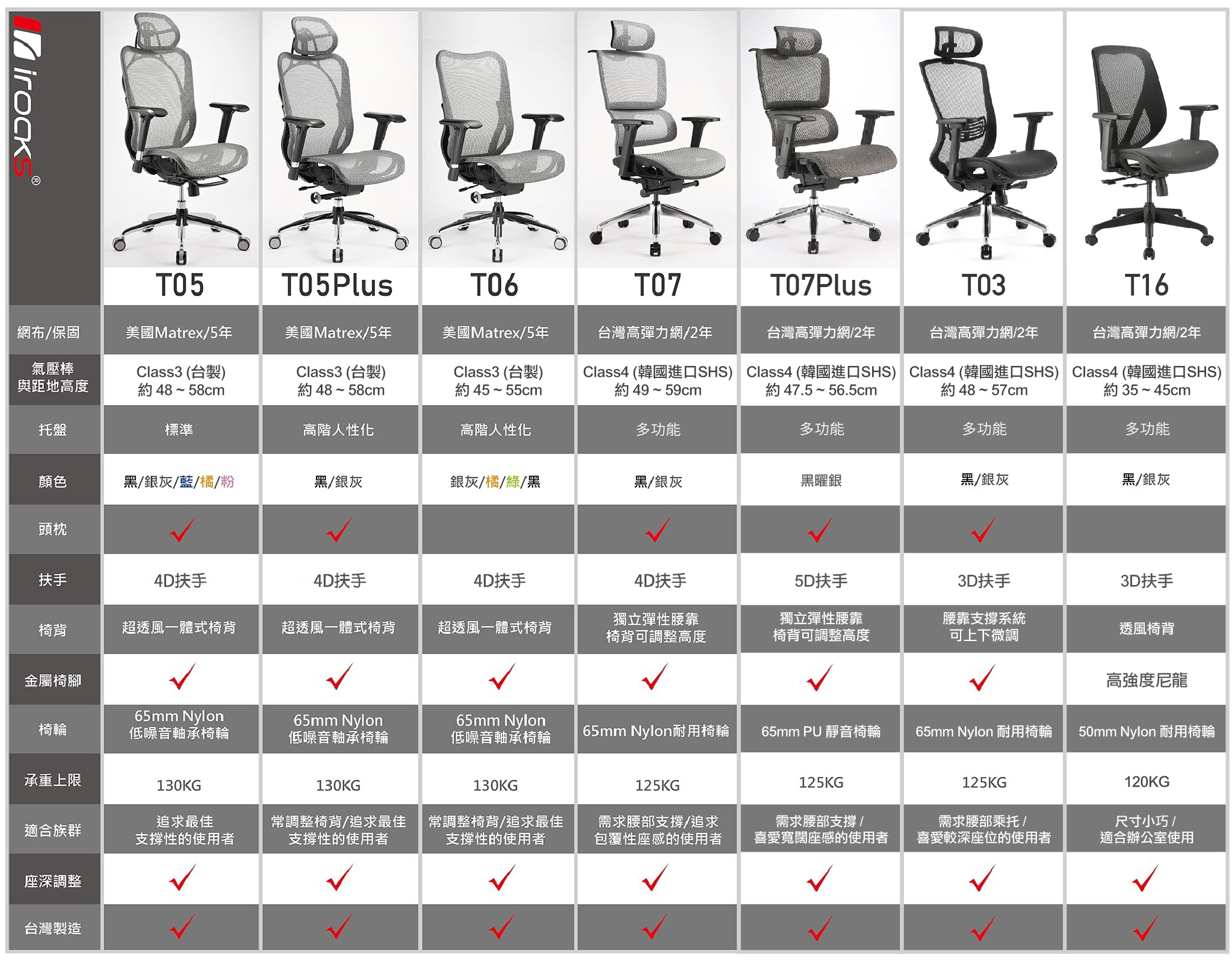 回顧 iRocks 自從 T05人體工學全網椅問世後好評不斷,iRocks 也傾聽消費者的需要,陸續推出 T05 Plus、T06 兩款系列全網椅,這三把皆為台灣製造 5 年保固。