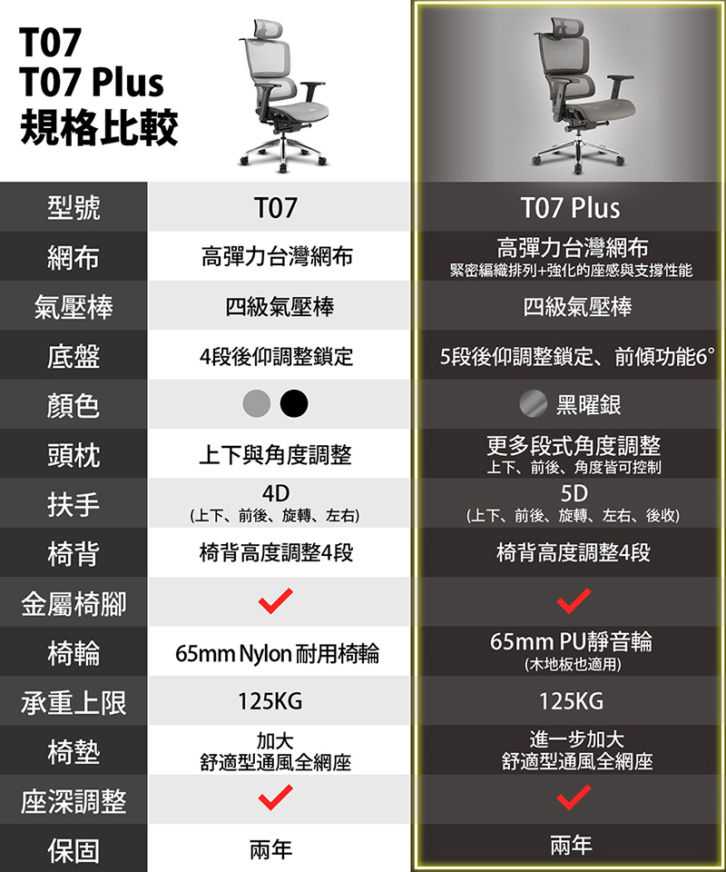 T05 Plus 與 T06 都是採用人性化多功能拖盤設計所有調控都在右手邊對於常需要調整椅背功能的玩家良好的體驗。差異在可調整式頭枕與背面骨架設計。椅輪也採用 65mm Nylon 低噪音軸承椅輪。