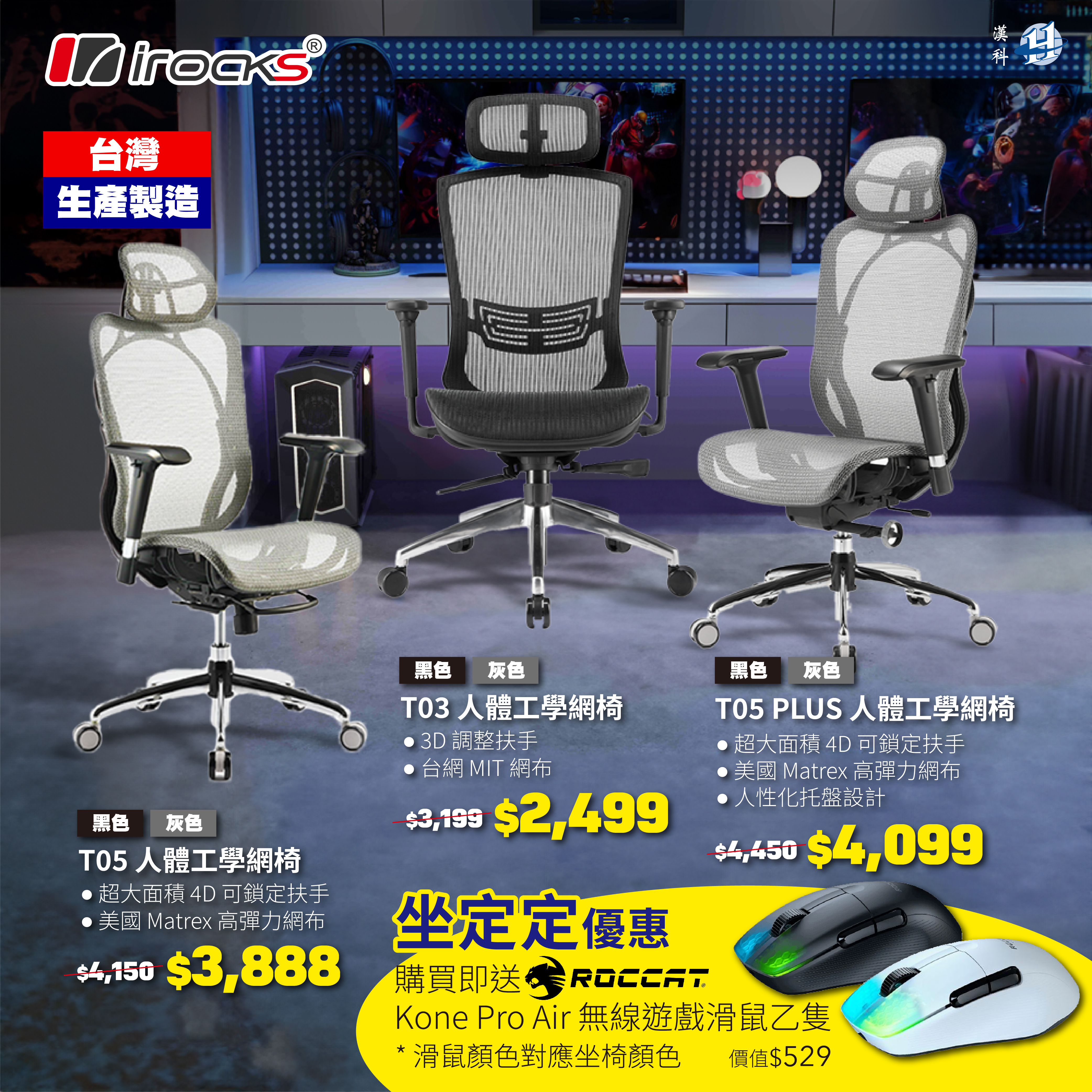 優惠期內購買 iRocks T03、T05 或 T05 Plus 系列人體工學座椅,即送 Roccat Kone Pro Air 無線電競滑鼠 1 隻 (如在本網店購買,滑鼠會在結賬時自動加入)。