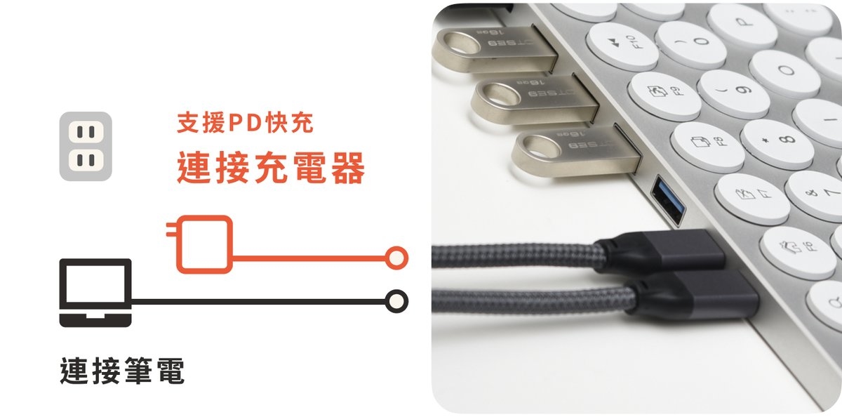 Kolude 有一個 Type-C PD 快充插孔,只要將鍵盤分別連接到筆電(或有 Type-C 的 iPad Pro)、PD 充電器,即可為裝置進行功率 18w - 100w 的快速充電!