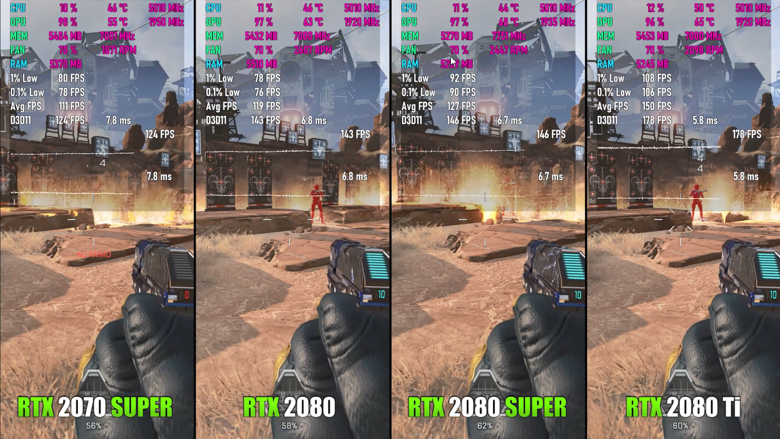 綜合以上表現,可見 RTX2080Ti 比 RTX2070 Super 效能快大約快30%-50%,提供較好的 FPS(每秒幀數)。當然,玩家可把畫質降低以提升顯示卡的效能,一般而言 RTX2070 Super 及 RTX2080 Super 能應付 2K 中高畫質設定遊戲,如需執行超高畫質則建議選用 RTX2080Ti。