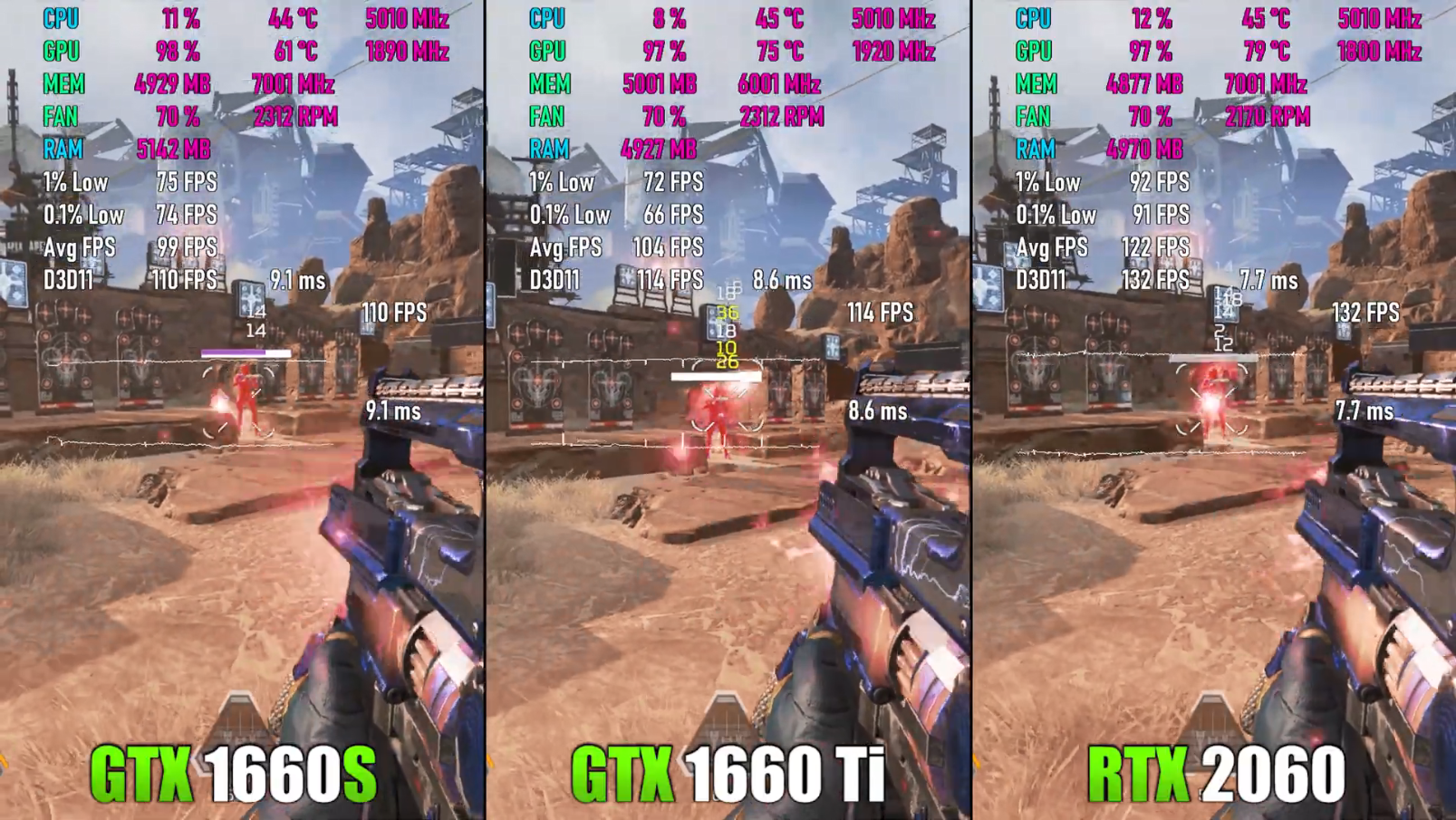 Apex Legends 和 PUBG 在 FHD 高畫質設定下,GTX1660 Super 至 RTX2060 系列都能提供110或以上的 FPS(每秒幀數),表現十分理想並能帶給玩家流暢的畫面。