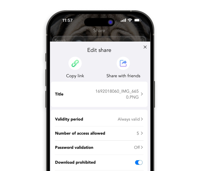 美好的回憶需要與親朋好友間分享,透過設定分享的名稱、有效期限、允許被存取次數、下載權限、密碼驗證,TNAS Mobile 3 可以方便快速的分享您的照片。