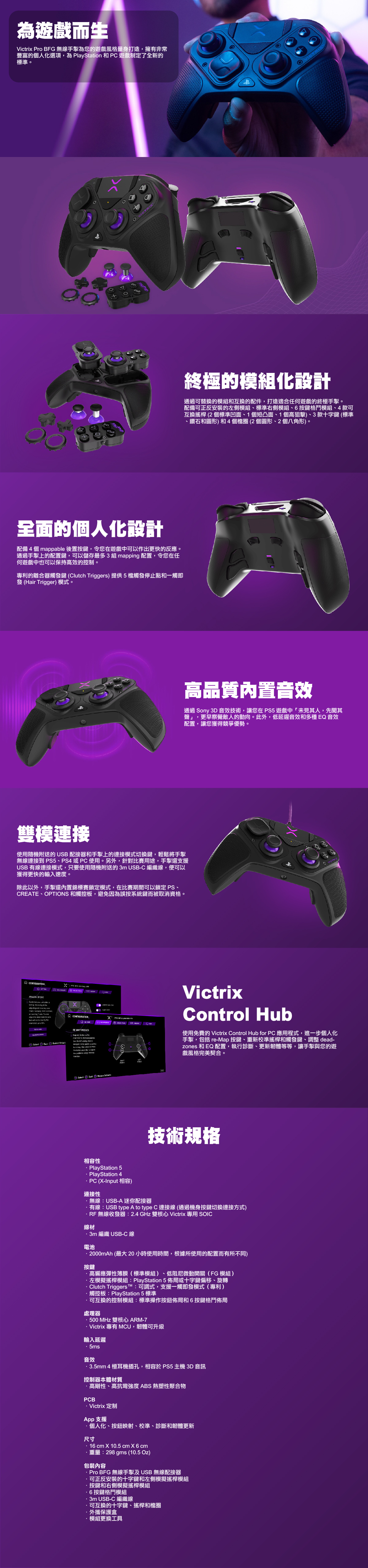 • 免費 Victrix Control Hub app,支援 re-map 按鍵、重新校準搖桿及觸發鍵、調整 deadzones 和 EQ 設定、執行診斷、更新韌體等等