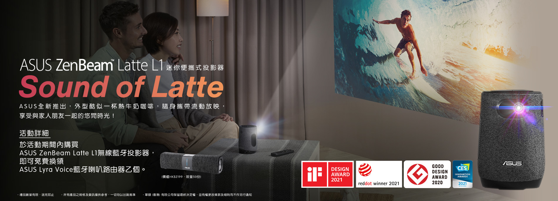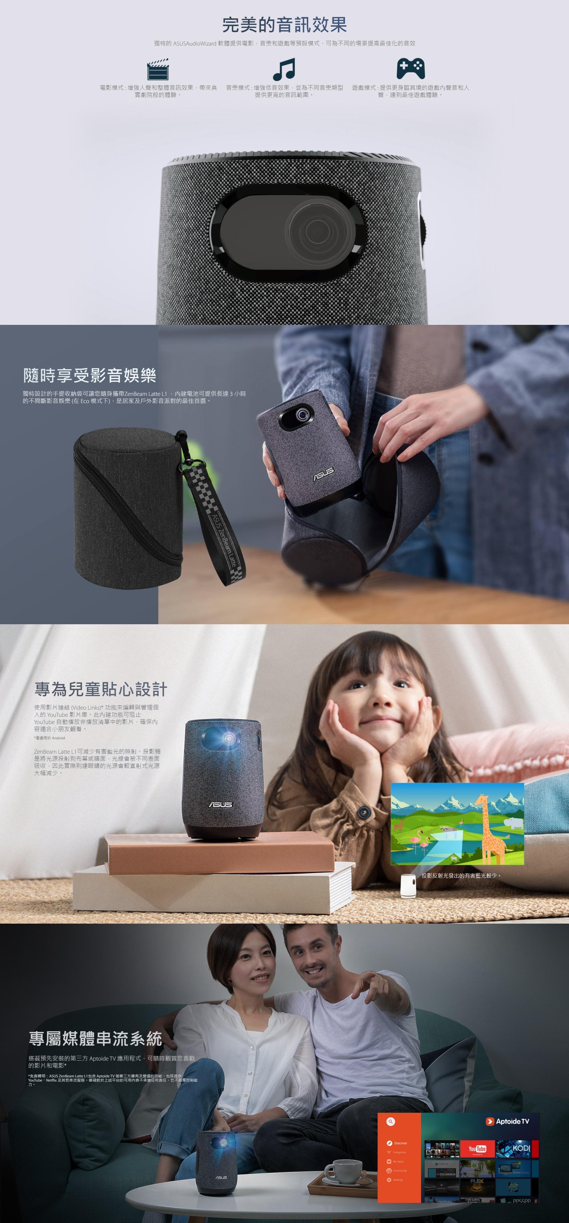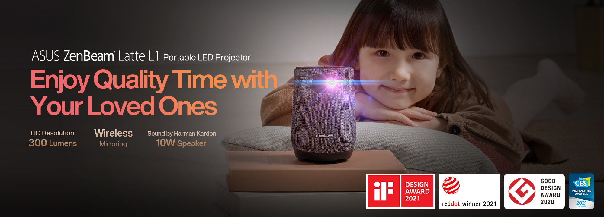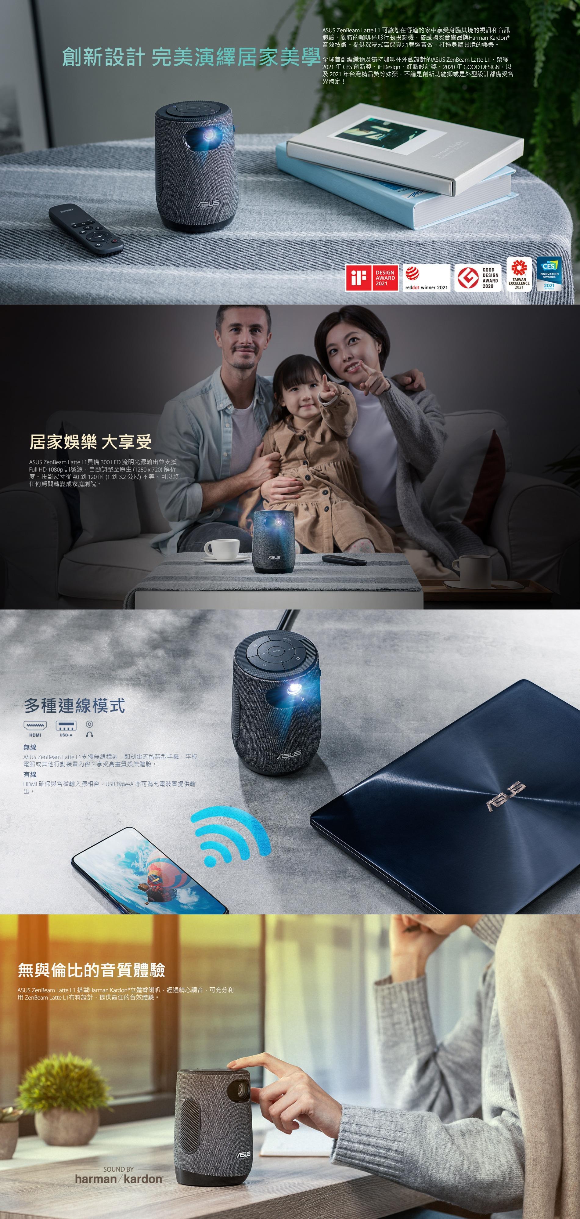 ASUS ZenBeam Latte L1無線藍牙行動投影機– 300 流明、720p、Harman Kardon 音效、10 W Bluetooth®、3 小時視訊播放、無線投影、內建電池、USB Type-A、HDMI®