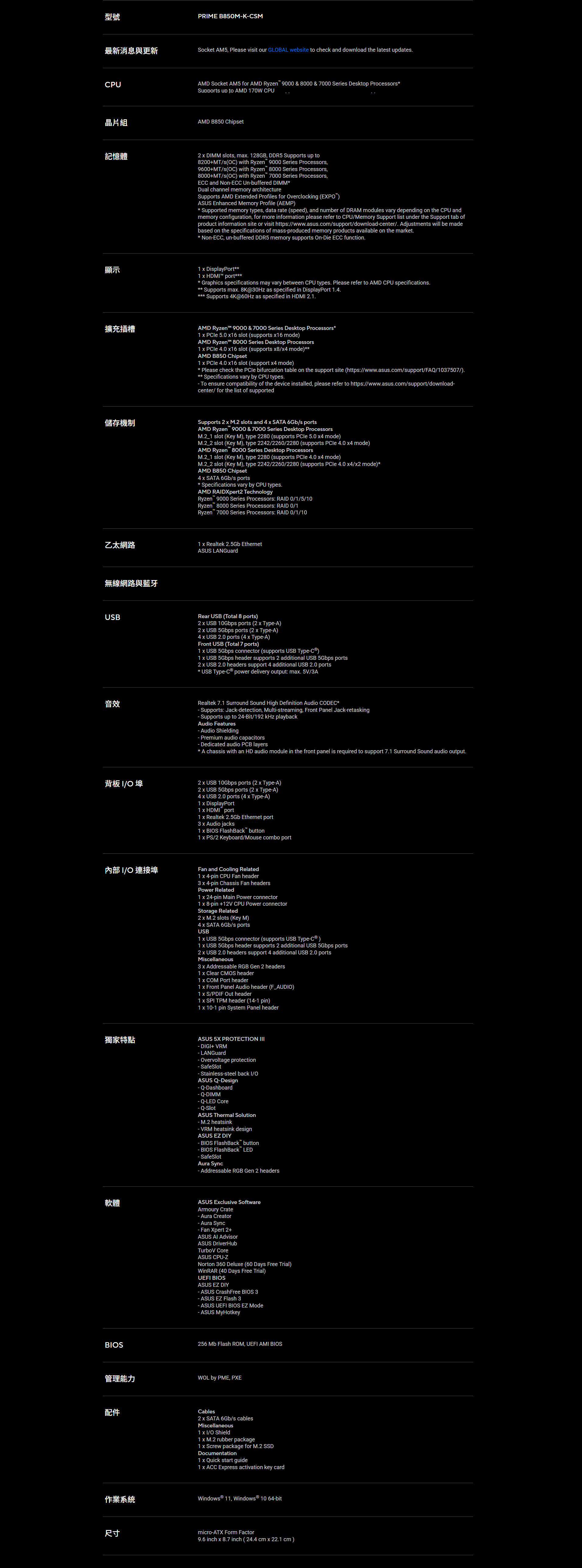 ASUS Prime 系列主機板經過精心設計,可完全發揮 AMD RyzenPRIME B850M-K-CSM主機板透過直覺的軟體和韌體功能,提供使用者和PC DIY建置者一系列的效能最佳化。它的設計是進階 AI PC-ready,提供嚴苛 AI 應用所需的電力與連線能力。