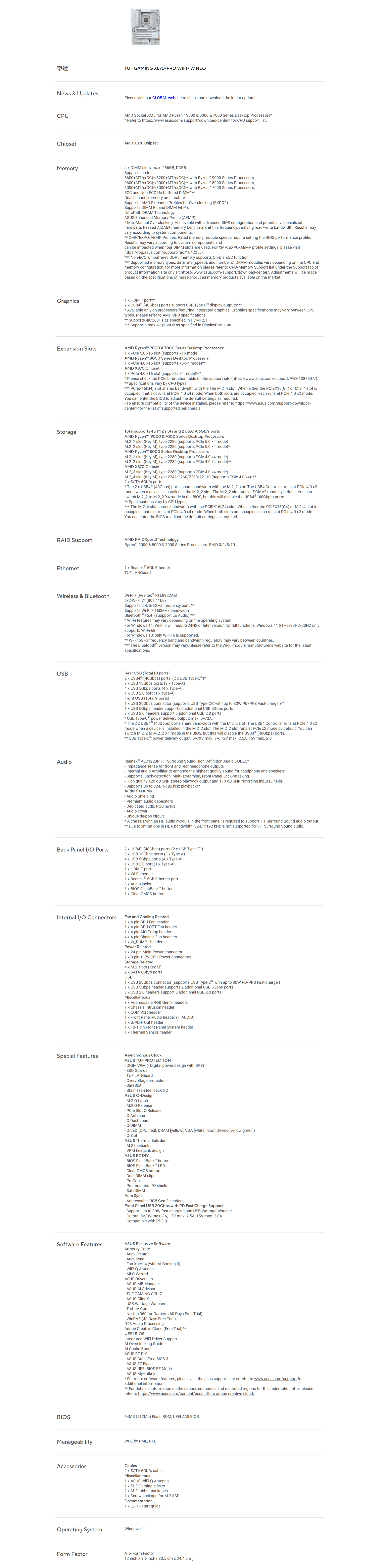 ASUS TUF GAMING X870-PRO WIFI7 W NEO 可發揮最新 AMD Ryzen™ 處理器的重要元素,並結合適合電競的功能與通過考驗的耐用性。此款主機板採用升級的電源解決方案及全方位的散熱系統,可提供堅如磐石且超乎預期的效能,以因應長時間的遊戲需求。TUF GAMING 主機板也經過嚴格的耐久性測試,確保能夠勝任其他產品無法承受的條件。此平台提供 Advanced AI PC 應用程式所需的運算能力與連線功能。