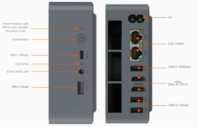 HDMI x 2 USB 3.2 Type-C x 1 (10 Gbps) USB 3.2 Type-A x 3 (10 Gbps) USB 2.0 x 1 Gb Ethernet Ports x 2 (10/100/1000 Mbps) 3.5mm Audio Jack x 1 Power indicator (white is on) Clear CMOS hole x 1 Power Button |