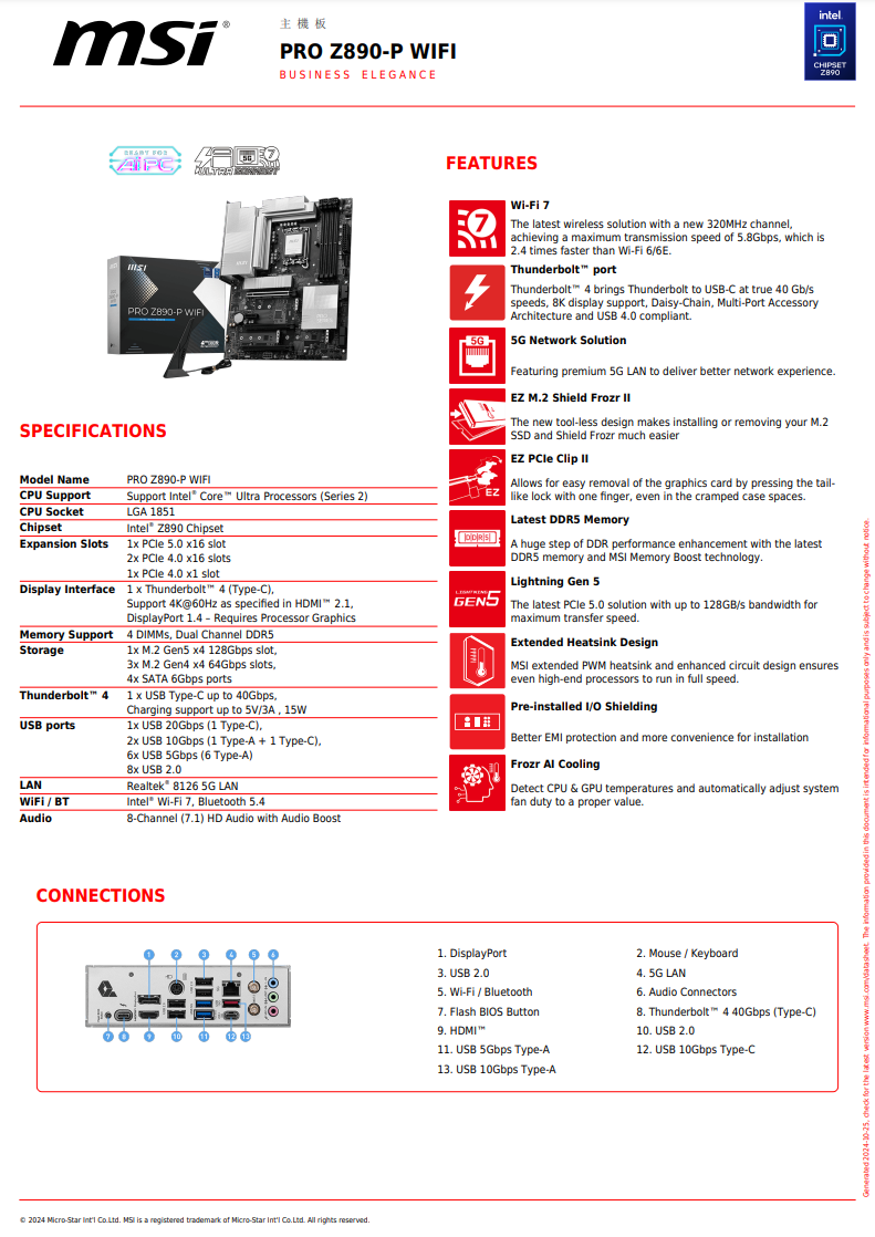 MSI PRO Z890-P WIFI 主機板 (MB-MZ89PW)
