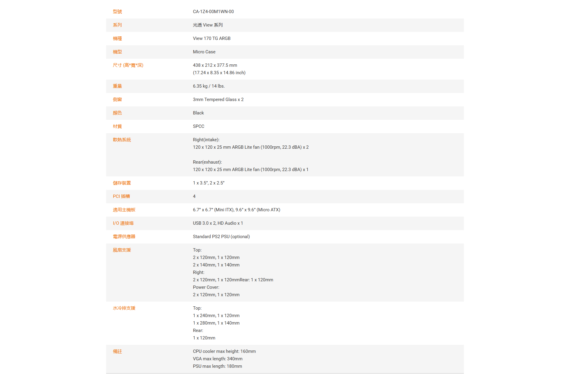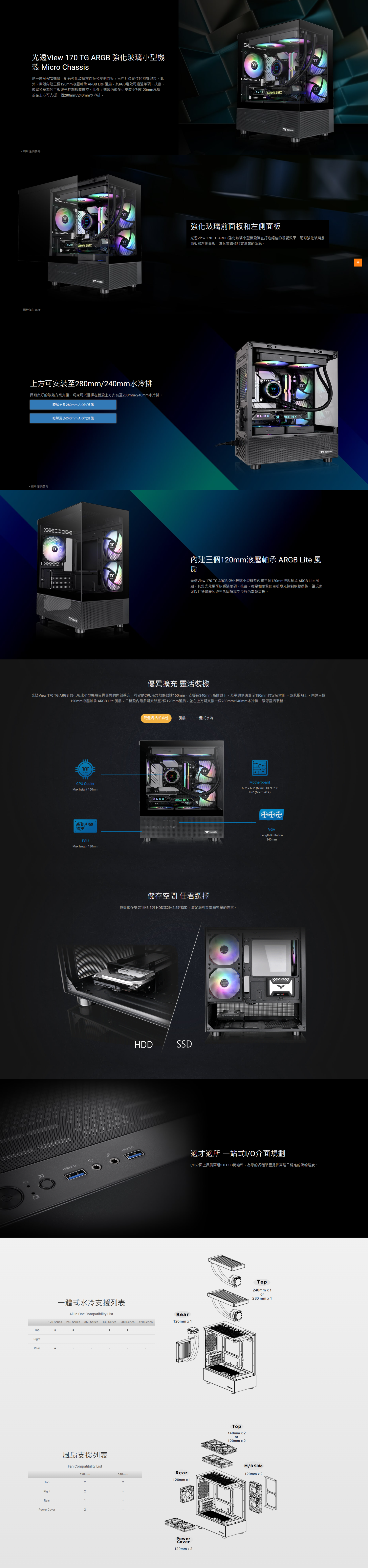 View 170 TG ARGB 是一款M-ATX機殼,配有強化玻璃前面板和左側面板,旨在打造絕佳的視覺效果。此外,機殼內建三個120mm液壓軸承 ARGB Lite 風扇,其RGB燈效可透過華碩、技嘉、微星和華擎的主板燈光控制軟體操控。此外,機殼內最多可安裝至7個120mm風扇,並在上方可支援一個280mm/240mm水冷排。