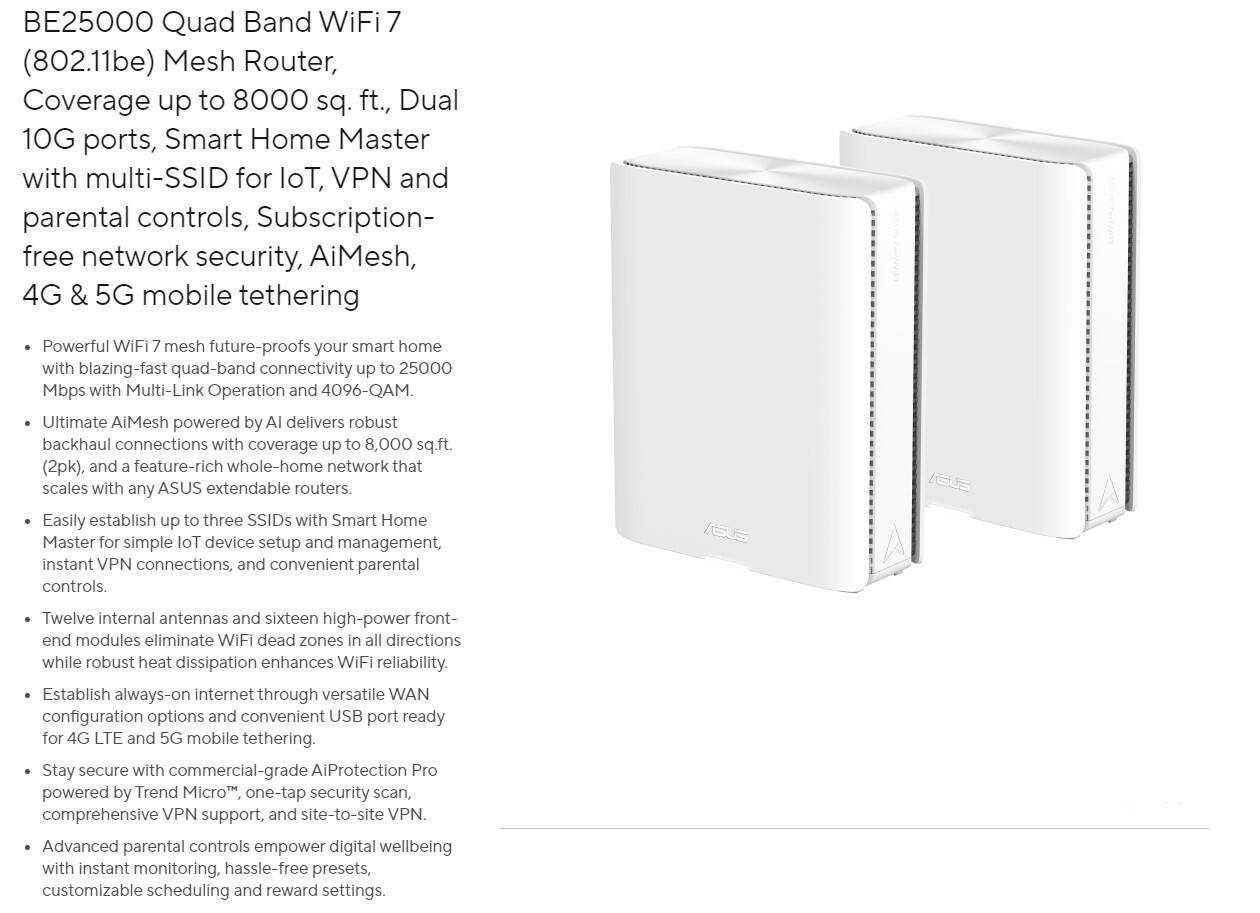 BE25000 Quad Band WiFi 7 (802.11be) Mesh Router, Coverage up to 8000 sq. ft., Dual 10G ports, Smart Home Master with multi-SSID for IoT, VPN and parental controls, Subscription-free network security, AiMesh, 4G & 5G mobile tethering