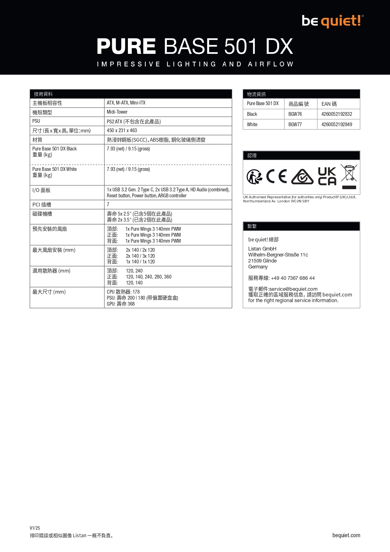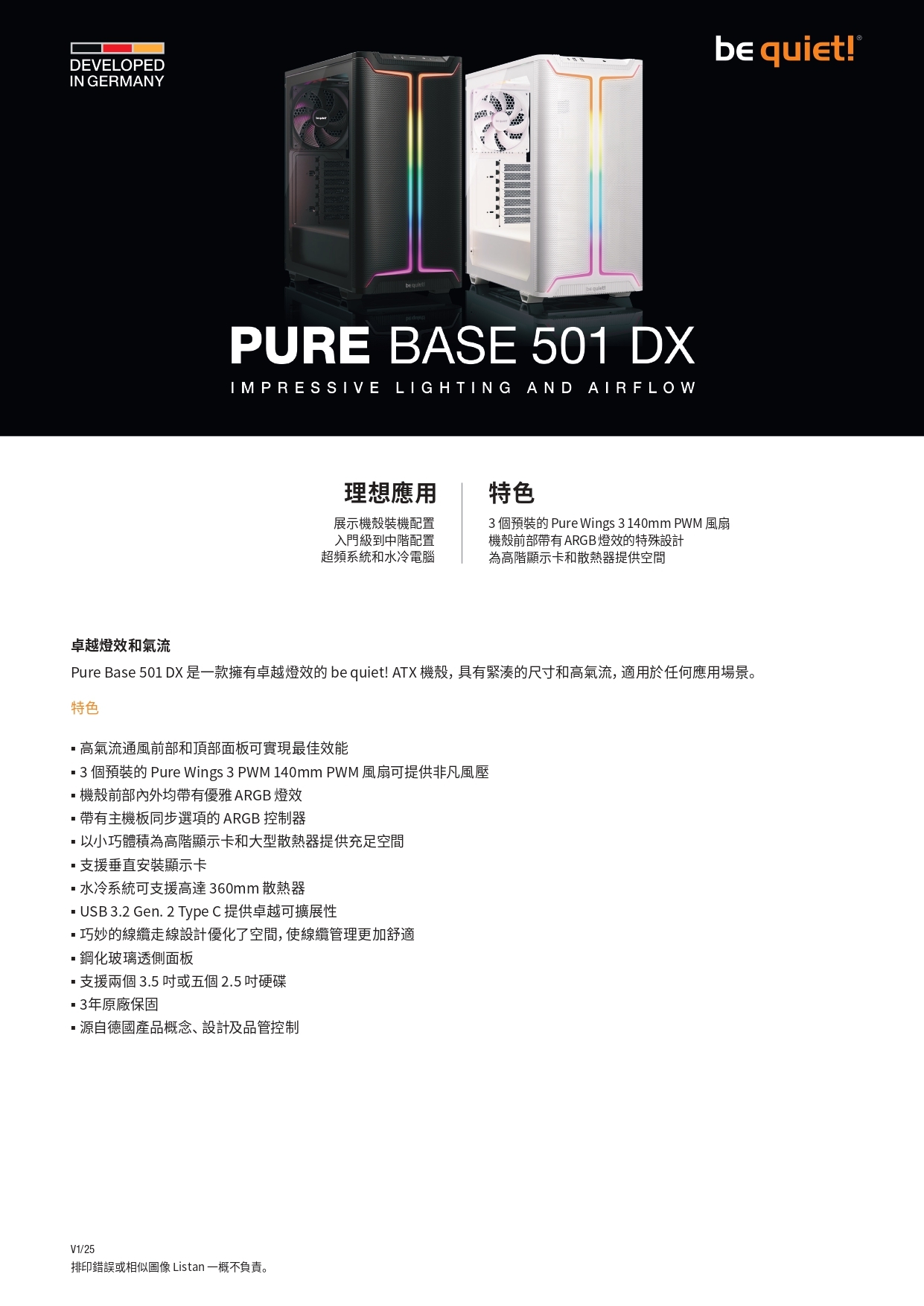 Pure Base 501 DX White 是一款擁有卓越燈效的 be quiet! ATX 機殼,具有緊湊的尺寸和高氣流,適用於任何應用場景。