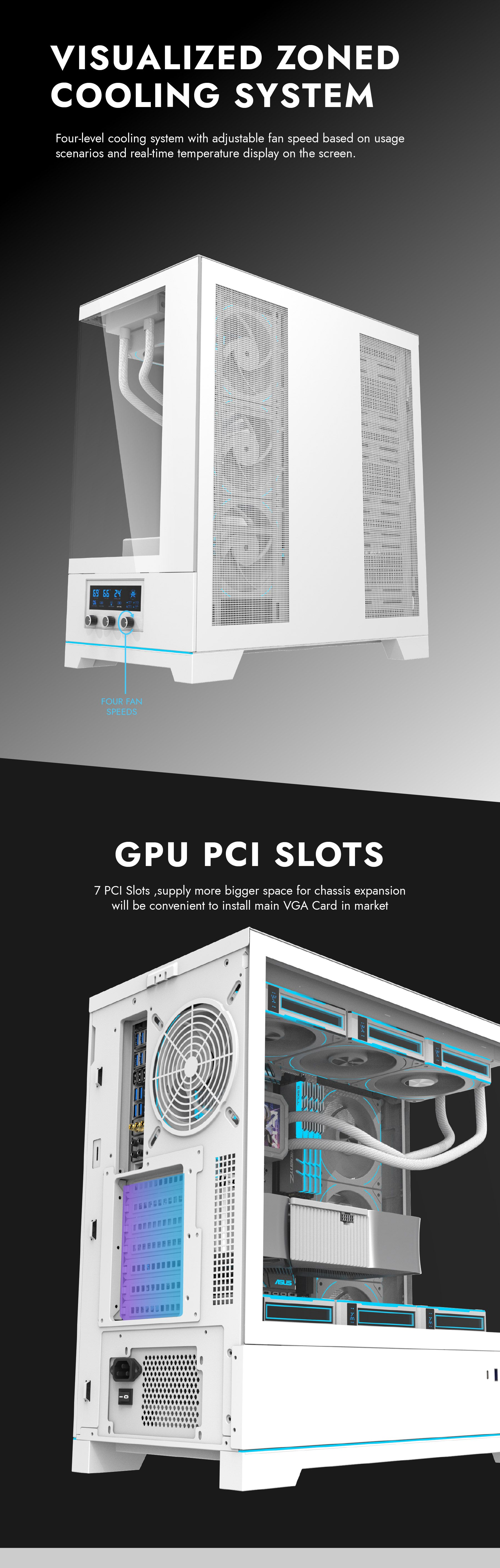 Four-level cooling system with adjustable fan speed and real-time temperature display.