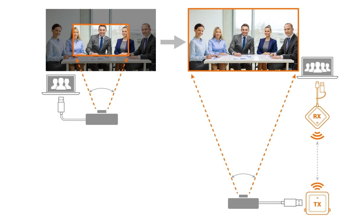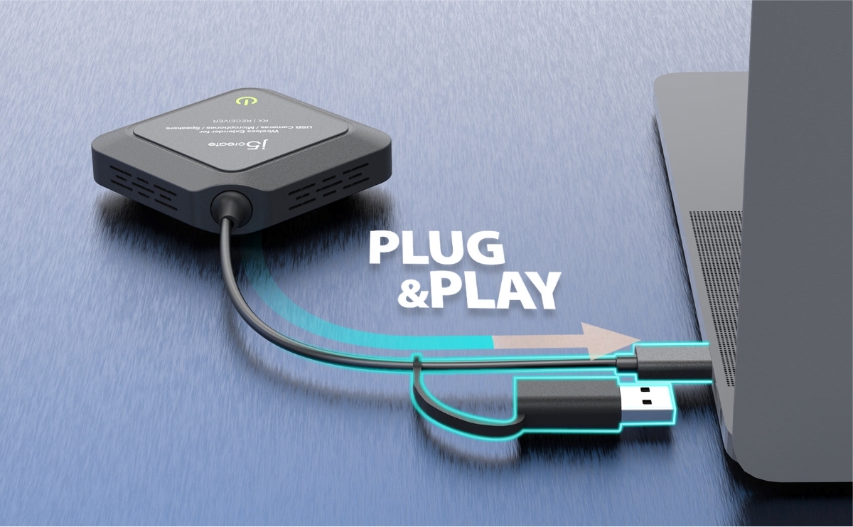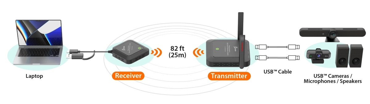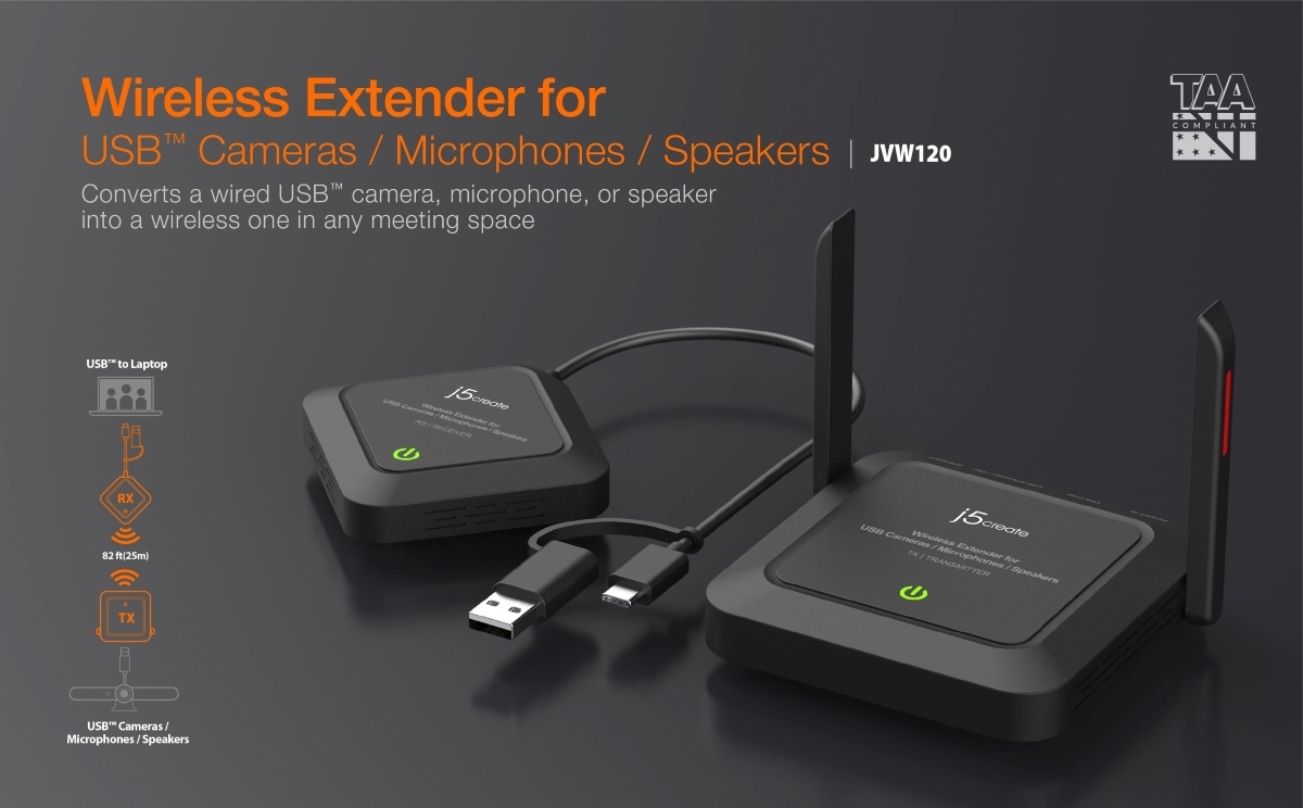The j5create Wireless Extender for USB™ Cameras / Microphones / Speakers turn your wired USB™ camera into a wireless one. With a wireless transmission range of up to 82 ft. (25m)