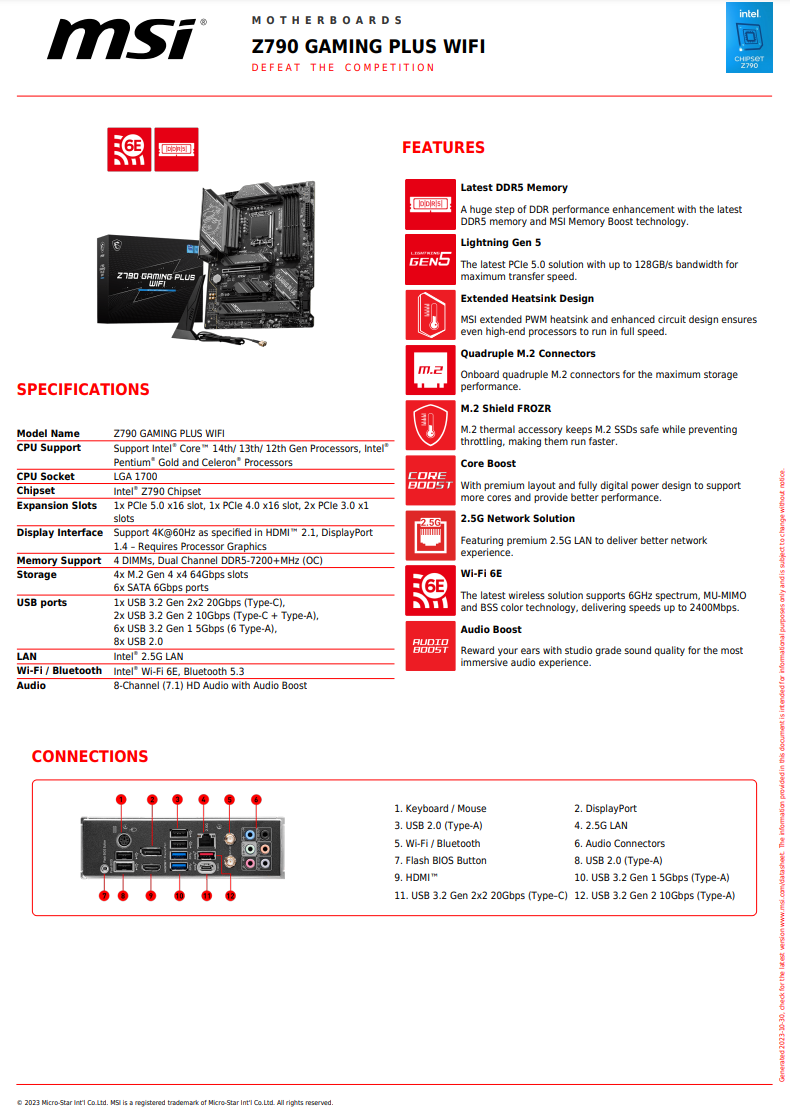 MSI Z790 GAMING PLUS WIFI 主機板 (MB-MZ79G+W)