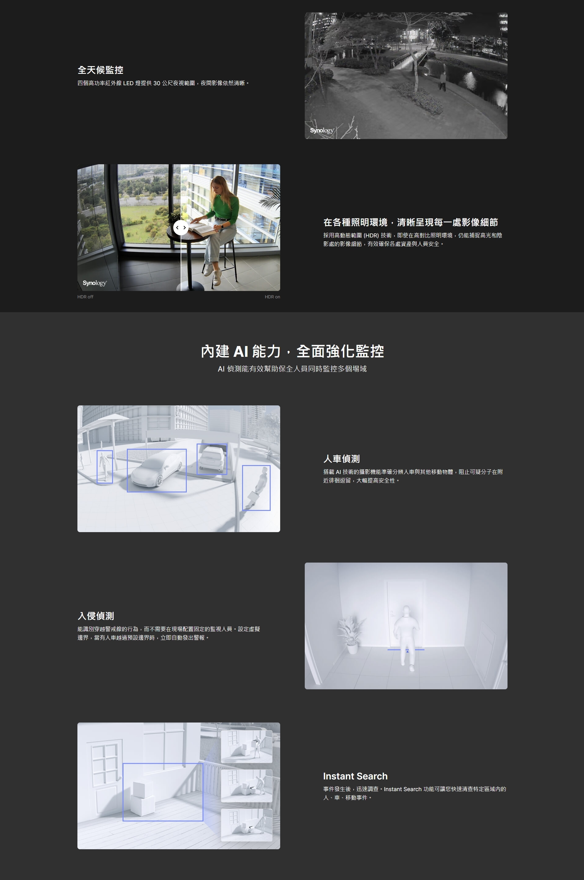 內建 AI 功能:人員和車輛檢測、入侵檢測和即時搜索,允許用戶識別潛在威脅、快速調查感興趣的區域以及追踪和檢索相關鏡頭。
