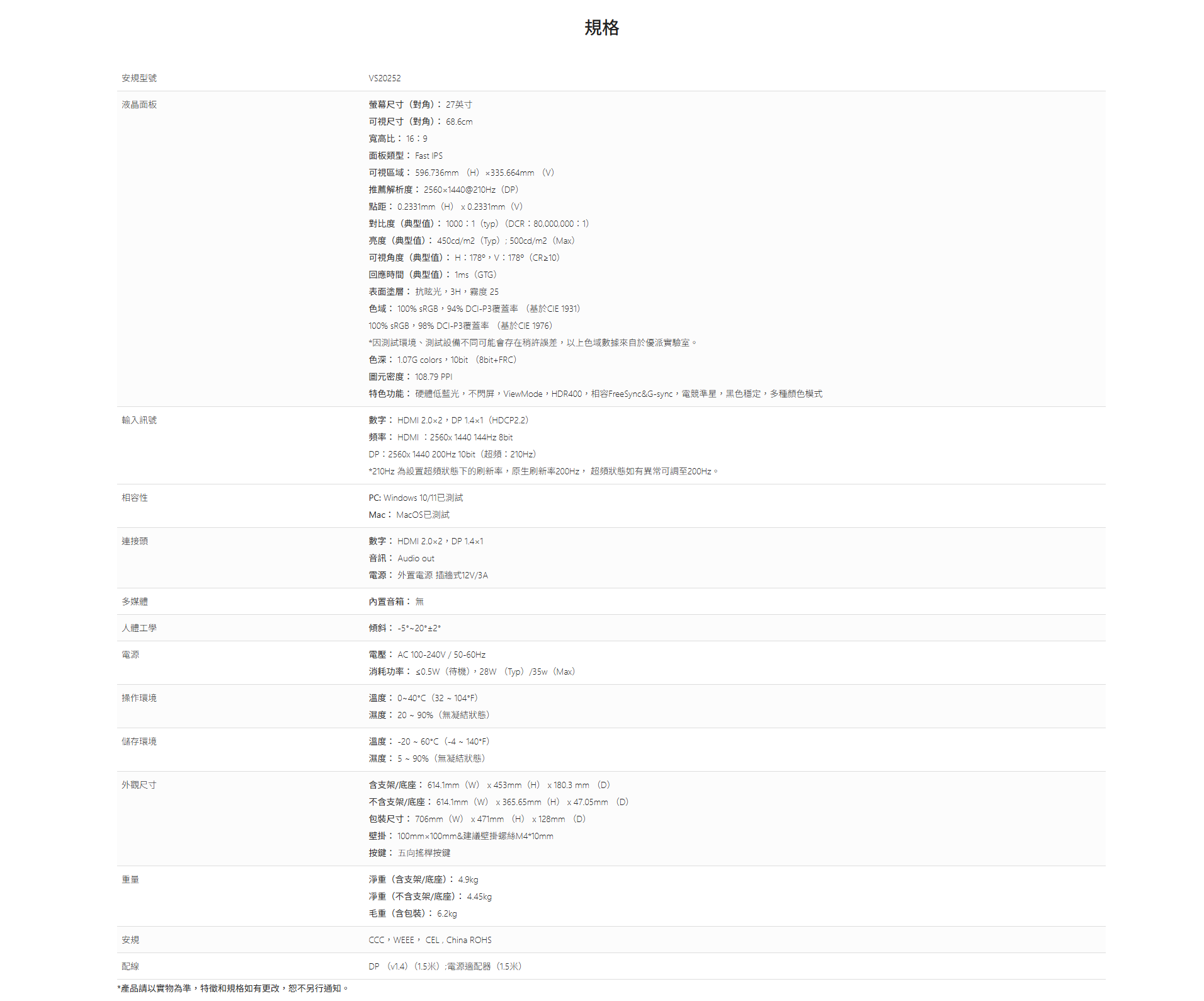 輸入接頭:2 × HDMI , 1 × DisplayPort , 1 x 3.5mm 音訊輸出