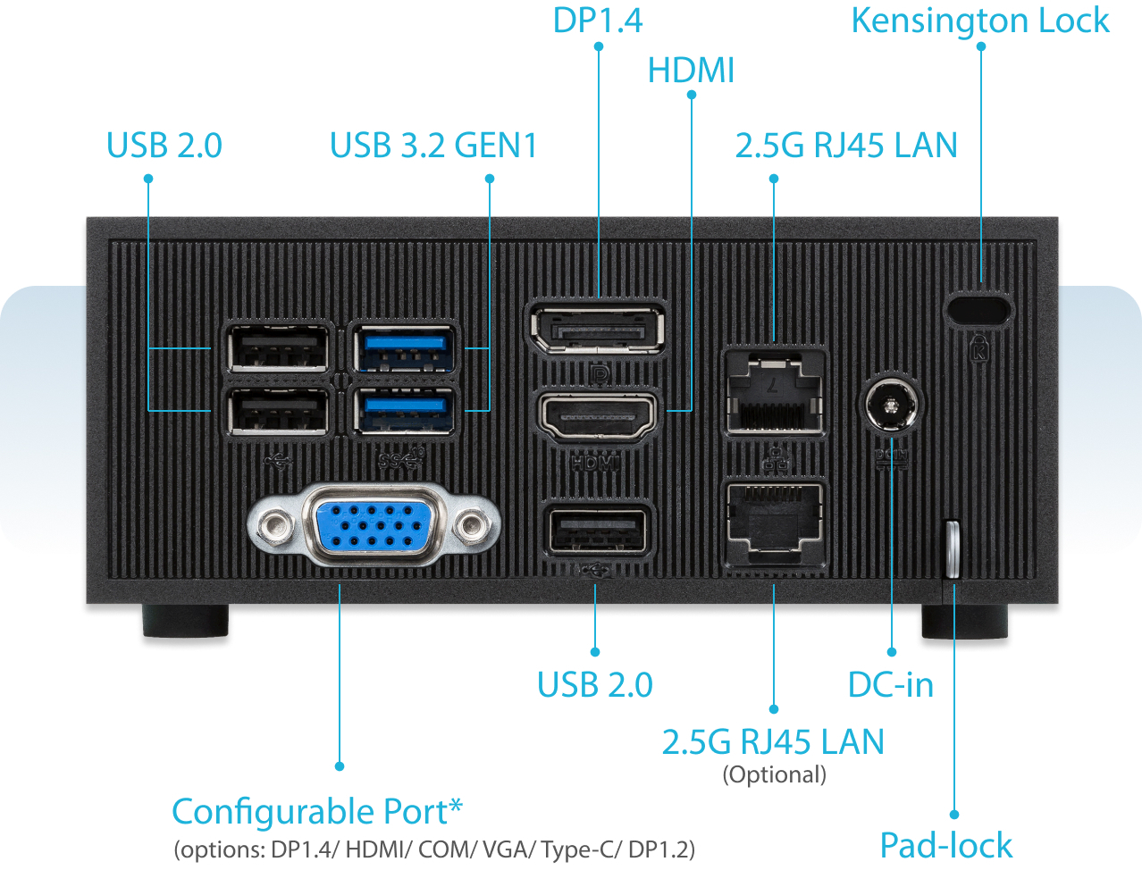 | Back I/O Ports | 2 x USB 3.2 Gen1 Type-A 3 x USB 2.0 1 x DisplayPort 1 x HDMI 1 x 2.5G RJ45 LAN 1 x Configurable port (VGA ) 1 x DC-in |