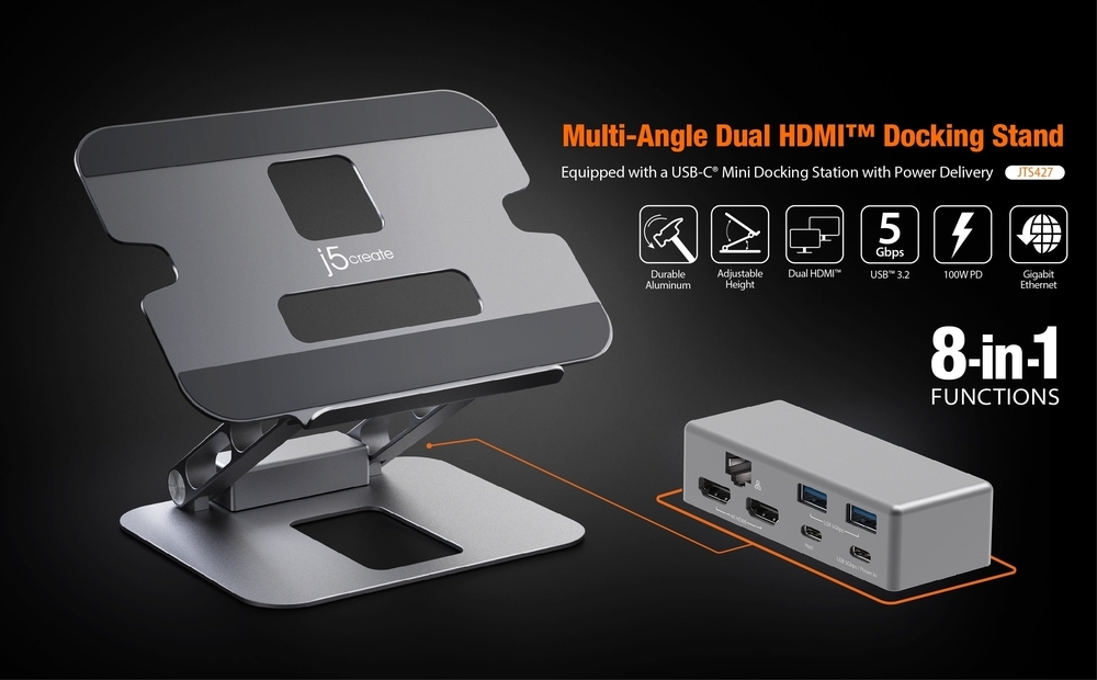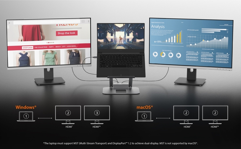 | 接口 | 1 - USB-C® 5Gbps (數據傳輸 & Power Delivery 3.0) 2 - USB™ 5Gbps Type-A 2- HDMI™ (單輸出 4K、雙輸出 1080p) 1 - Gigabit Ethernet |