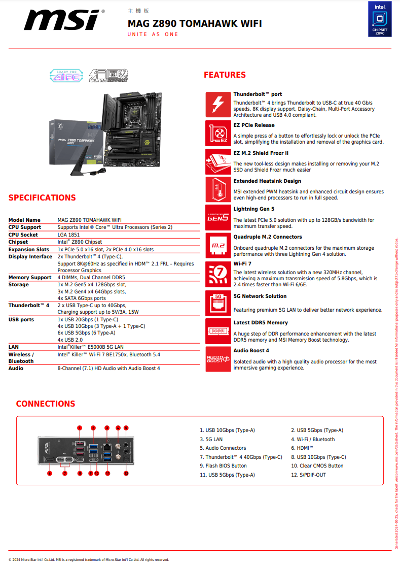 MSI MAG Z890 TOMAHAWK WIFI 主機板 (MB-MZ89TW)