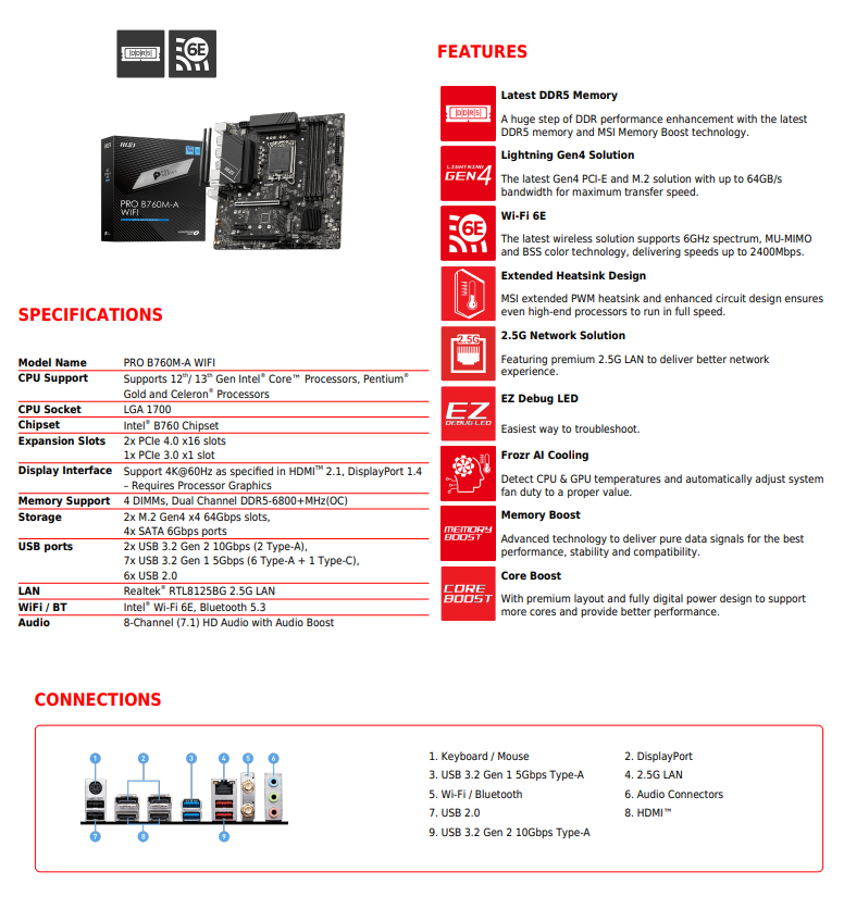 MSI主機板PRO B760M-A WIFI MB-MB76AW5