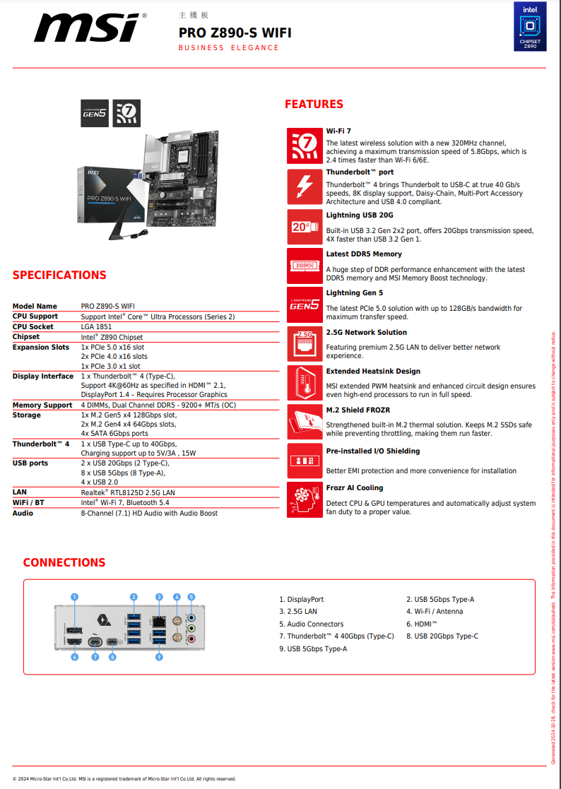 MSI PRO Z890-S WIFI 主機板 (MB-MZ89SW)