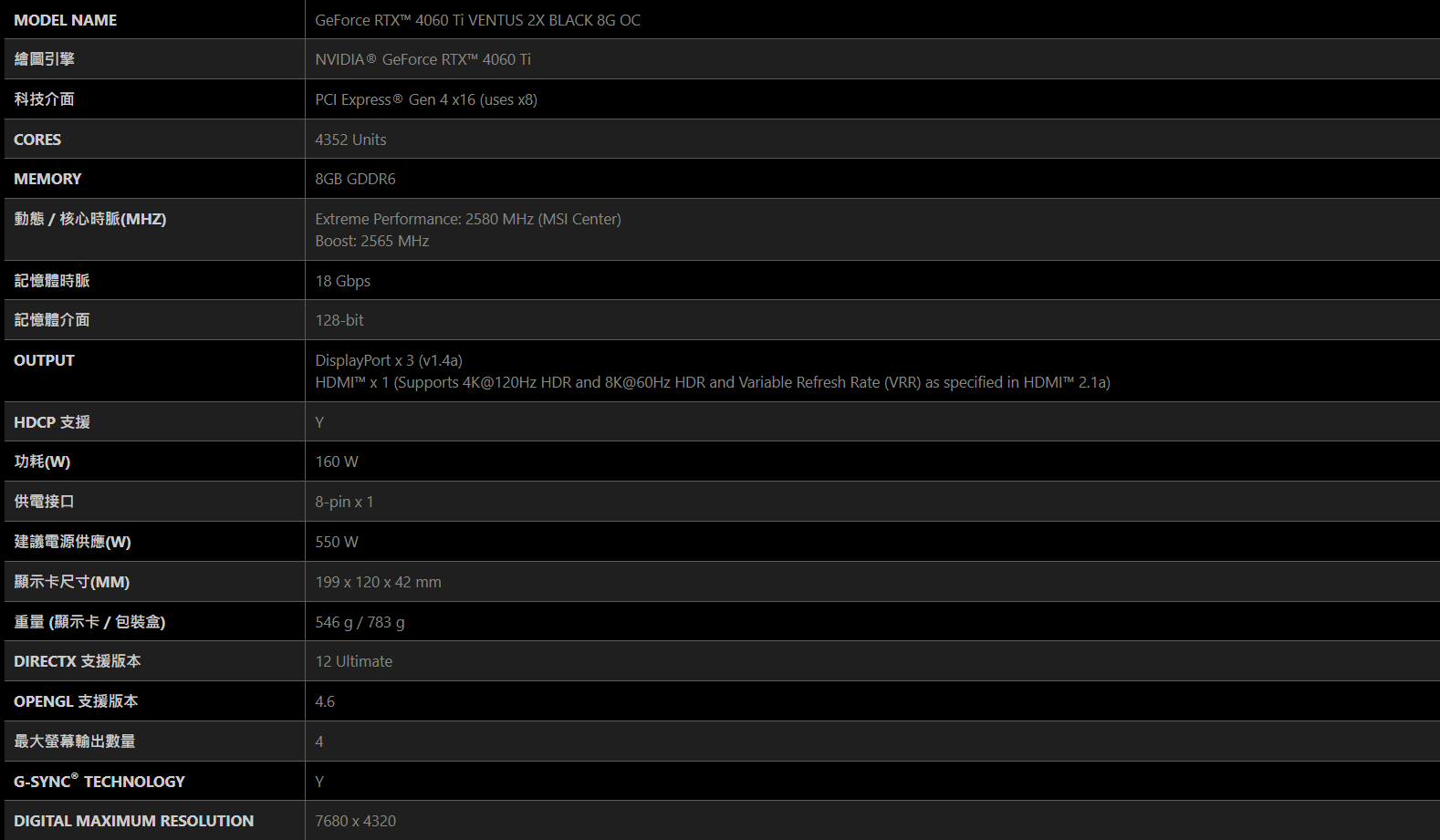 MSI顯示卡RTX 4060 Ti VENTUS 2X BLACK 8G OC (DI-N406TV8)