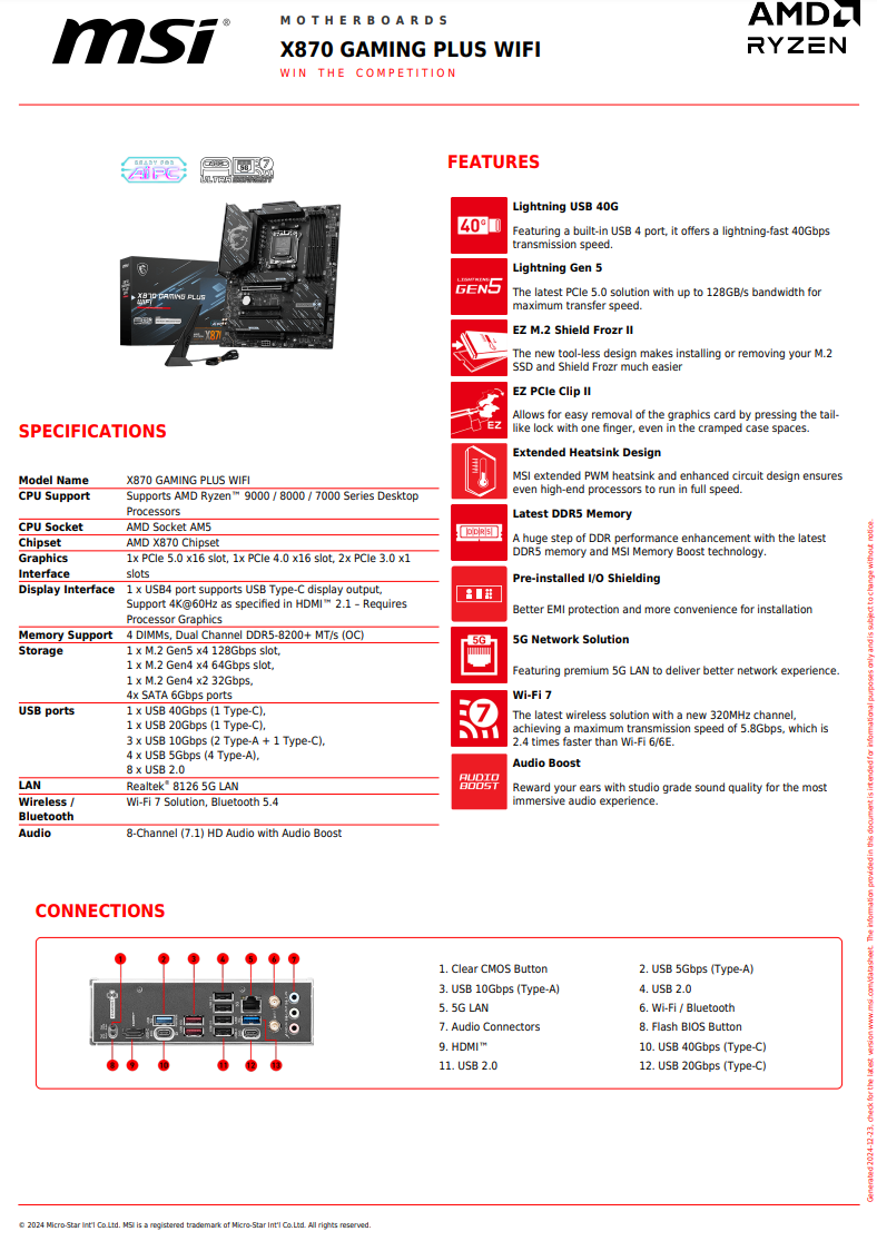 MSI X870 GAMING PLUS WIFI 主機板 (MB-RX87G+W)