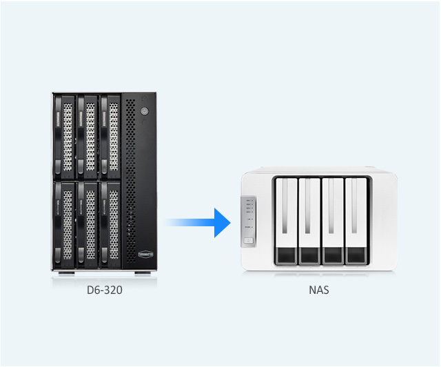 D6-320 can be connected to the USB interface of TerraMaster NAS after special adaptation and adjustment. Creating arrays and storage pools on D6-320 with TerraMaster TOS could expand the storage space of NAS. Remark: this function works only on TerraMaster NAS running TOS 5.1 or above.
