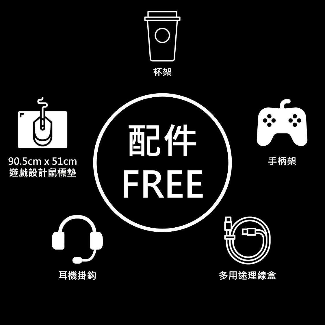 ▸ 附送總值 $785 配件 (鼠標墊、耳機掛鈎、杯架、手柄架、多用途理線盒)