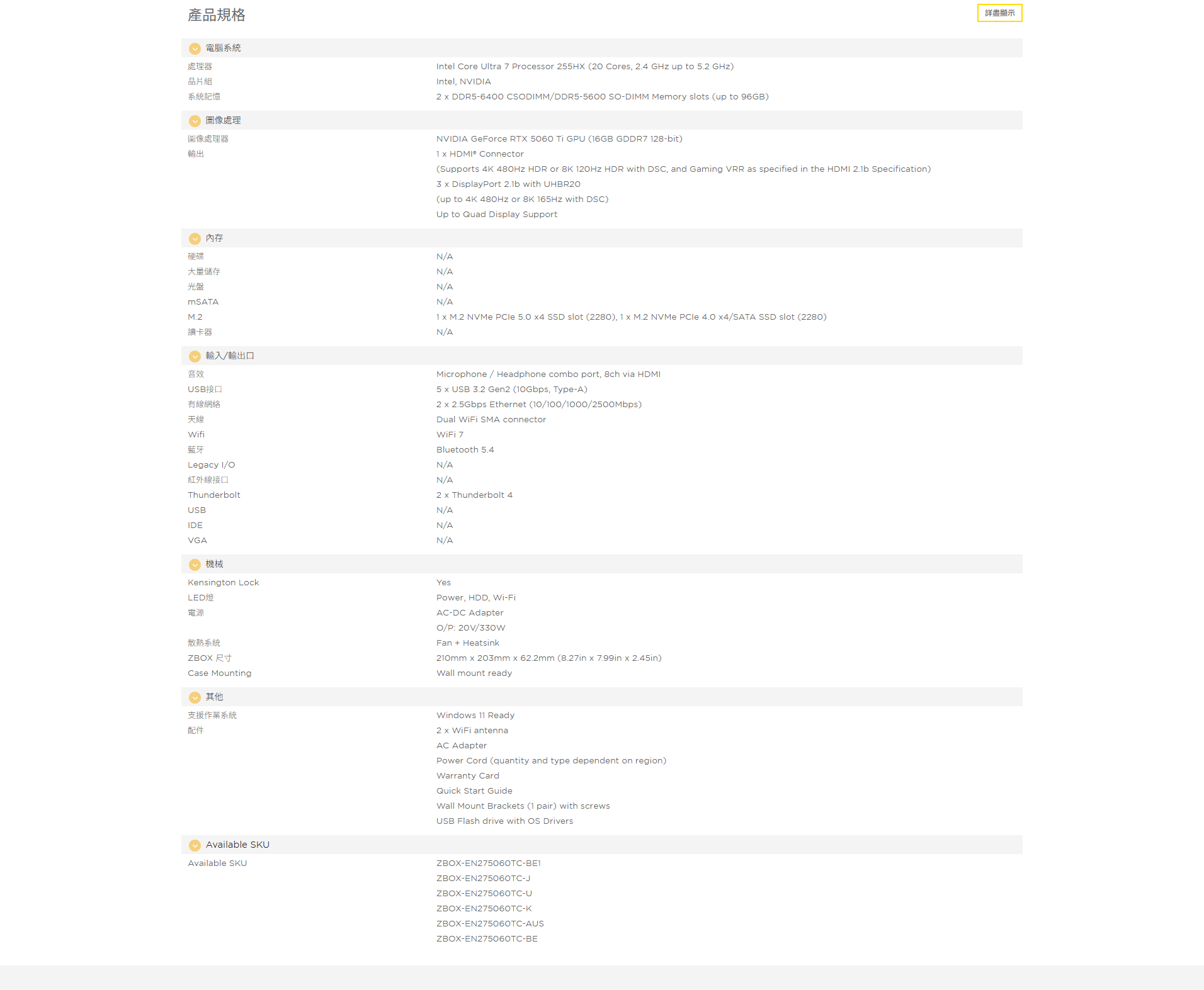 記憶體:2 x DDR5-6400 CSODIMM/DDR5-5600 SO-DIMM Memory slots (up to 96GB)